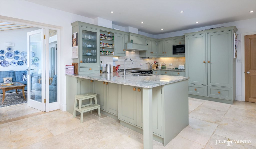 The interior of the house has been thoughtfully designed to create a refined and spacious family home, blending elegant proportions with a seamless flow between reception areas and informal living spaces. This layout caters to both contemporary family life and entertaining guests. The abundance of windows throughout the house maximizes the captivating countryside views and floods the rooms with natural light. French doors in the main living areas seamlessly connect the interior to the serene garden.