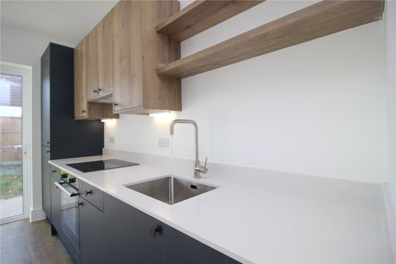 A lovely light room with folding doors that open directly onto the south backing garden; perfect for entertaining. A modern fitted kitchen comprises of range of full height, eye level and base storage units complemented by the quartz work surfaces with undermount sink and inset mixer tap. Matching quartz upstands. Inset hob under extractor. Built-in single oven.