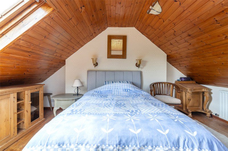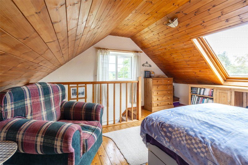Further stairs lead up to the second floor where there is a spacious third bedroom with a pine-clad gabled roof, rooflight, pine floor, and superb view over the garden.