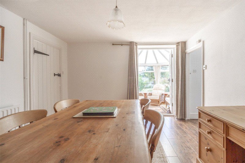 There is an entrance vestibule with window and coat hanging area. The dual aspect living room has a brick open fireplace, an attractive bay window and engineered oak flooring. The separate dining room has a brick fireplace with wood burner, 2 cupboards, engineered oak flooring, and glazed double doors to a conservatory with polycarbonate roof and oak flooring, and glazed double doors to the garden, giving a superb outlook.