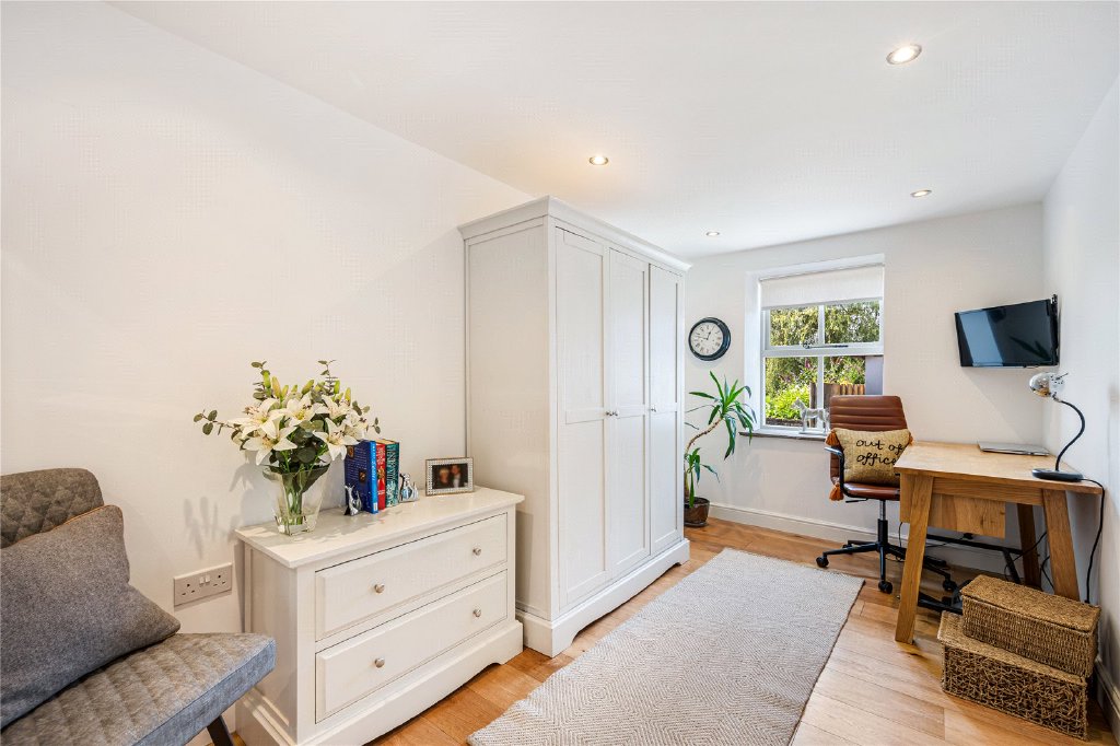 The living room is both warm and characterful, centred around a wood-burning stove set within an elegant stone fireplace, with oak flooring and bi-fold doors opening out to the rear. A separate office, also with oak flooring and a front-facing aspect, offers versatility and could readily serve as a fourth bedroom if required. A stylish 2pc cloakroom completes the ground floor.