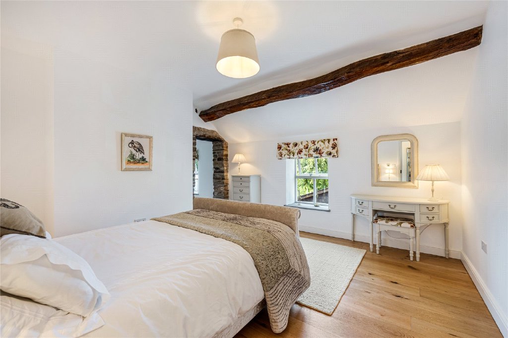A staircase, with a striking exposed stone wall, rises to a spacious first floor landing with a walk in storage cupboard and Velux window. There are three well-proportioned double bedrooms. The principal suite features oak flooring and a charming stone archway leading into a generous dressing room, which in turn opens into an en-suite with contemporary 3pc wet room with walk-in shower, vanity basin, dual flush WC, tiled flooring, chrome towel rail, and Velux window.