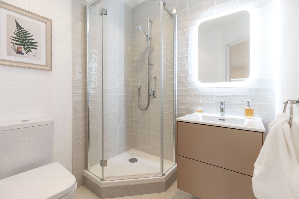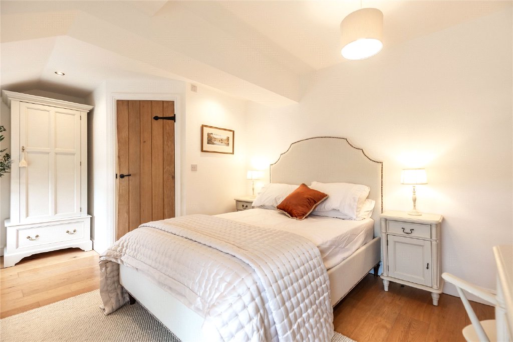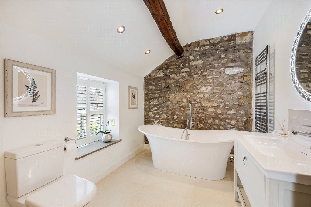 Bedroom two also benefits from oak flooring and a newly fitted 3pc en-suite shower room with a shower cubicle with direct feed wash basin, hand wash basin and low suite WC, tiled floor and walls, while bedroom three, similarly finished with oak flooring, is served by a beautifully appointed four-piece family bathroom. This luxurious space includes a freestanding stone bath, a walk-in shower with direct-feed attachment, hand wash basin, dual flush WC, tiled floor, exposed stone detailing to one wall, and a chrome towel rail.