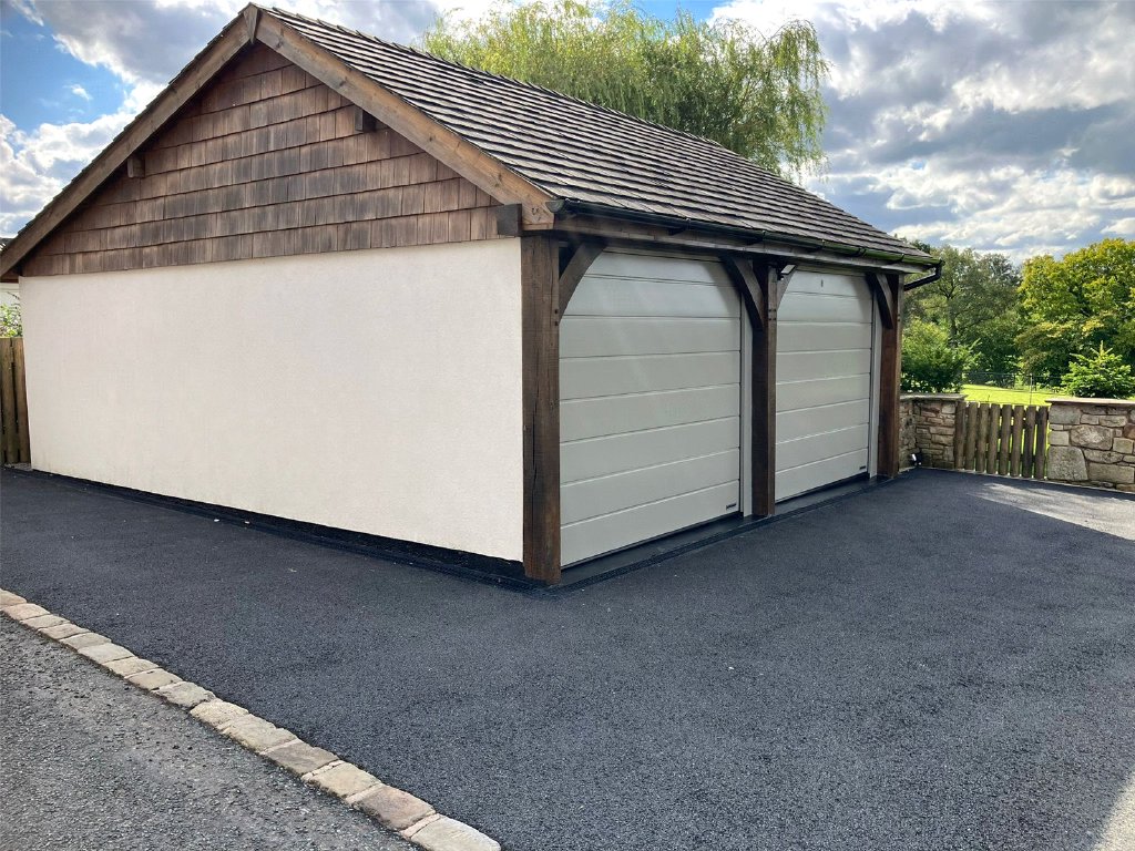 Outside, a stone-flagged seating area lies to the front, ideal for morning coffee. Beyond the lane, a spacious driveway provides ample off-road parking and gives access to a double garage, with twin up and over electric doors and power and light laid on. A water tap is also installed.