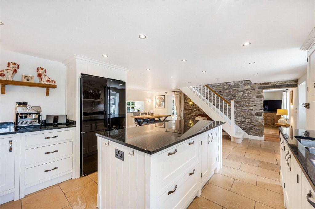 A welcoming open porch leads into the heart of the home – a superb dining kitchen fitted with an extensive range of high-quality hand built base and wall units, complete with a plate rail and granite work surfaces with matching upstands. A three-oven electric AGA with twin hotplates is complemented by a feature extractor with integrated lighting, alongside space for an American-style fridge freezer, an integrated dishwasher, a double bowl sink with mixer tap, and a central island with additional storage and a breakfast bar. Travertine flooring and a stable door to the rear complete this well-appointed space.