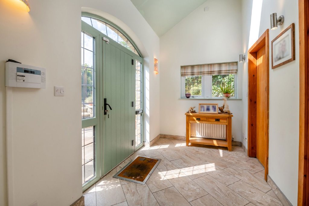 There is a traditional style barn arch that has a modern entrance door with glazed surround, this leads into the formal entrance hall. First impressions of the eye-catching character on display in the entrance hall include and exposed stone feature wall with timber lintel beam. The character of these features are a great introduction to the style found throughout the property. There are two traditional farmhouse style doors that lead into the ground floor shower room and utility room, and an open doorway leading into the dining kitchen.