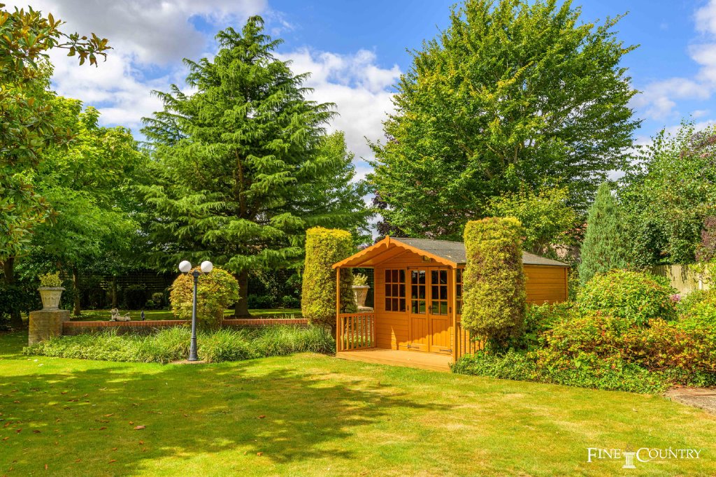 The secluded rear garden is a true delight, featuring majestic mature trees, a paved patio terrace and a summer house. The garden offers a sense of spaciousness near the home, gradually transitioning to the shade and privacy provided by well-maintained trees at its far end.