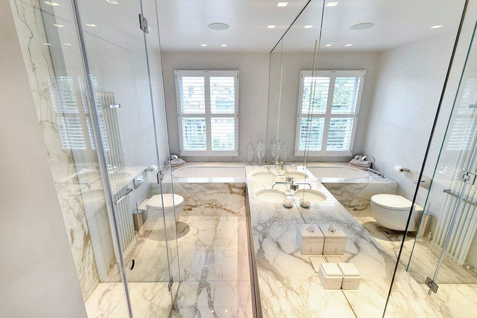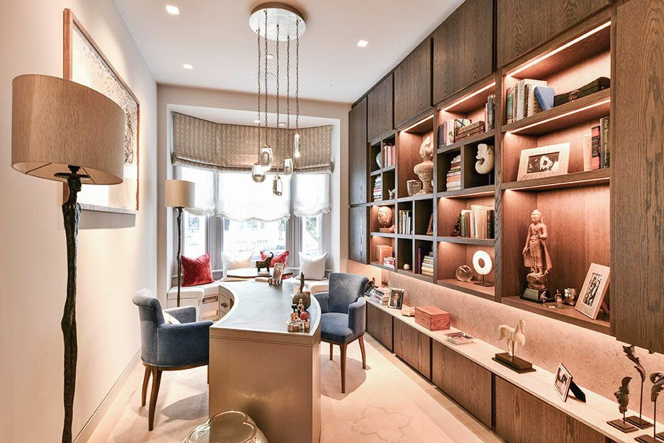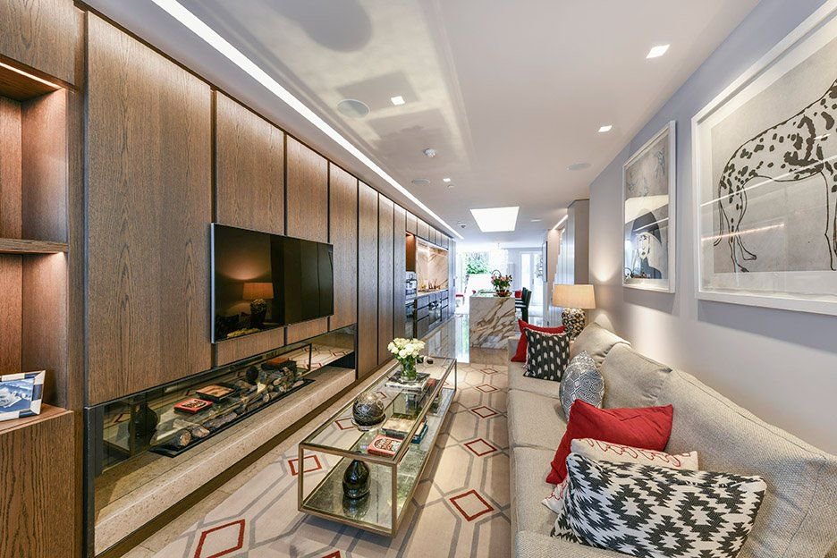 The staircase is elegantly designed and was altered to emphasise the light and flow down to the lower ground floor. This is arranged around a bespoke central kitchen with matched marble and gaggenau appliances built into fabulous joinery that conceals remarkable amounts of storage. The kitchen seamlessly blends into a family TV room to the front and a full-width dining room with glazed doors into the garden.