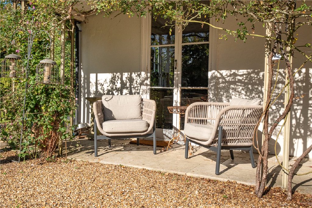 The property is approached via a gravel carriage driveway, which brings one to the front of the house, with its stucco fronted elevation and charming rose clad veranda extending across the entire frontage. The front door opens onto a generous hallway with flagstone flooring and underfloor heating, built in cabinetry and doors onto the principal reception rooms. The drawing room is a handsome room with bespoke bookshelves along one wall, ornate cornicing and plasterwork, marble fireplace and French doors onto the garden. The dining room sits between the entrance hall and the kitchen, and provides an excellent entertaining space with feature fireplace, period oak floorboards and French doors. The kitchen / breakfast room has a range of bespoke solid wood units double butler sink and electric AGA, and also has doors onto the veranda. Additional ground floor accommodation includes a sitting room, which is ideal for less formal family use, downstairs w/c, utility / cellar and boot room.