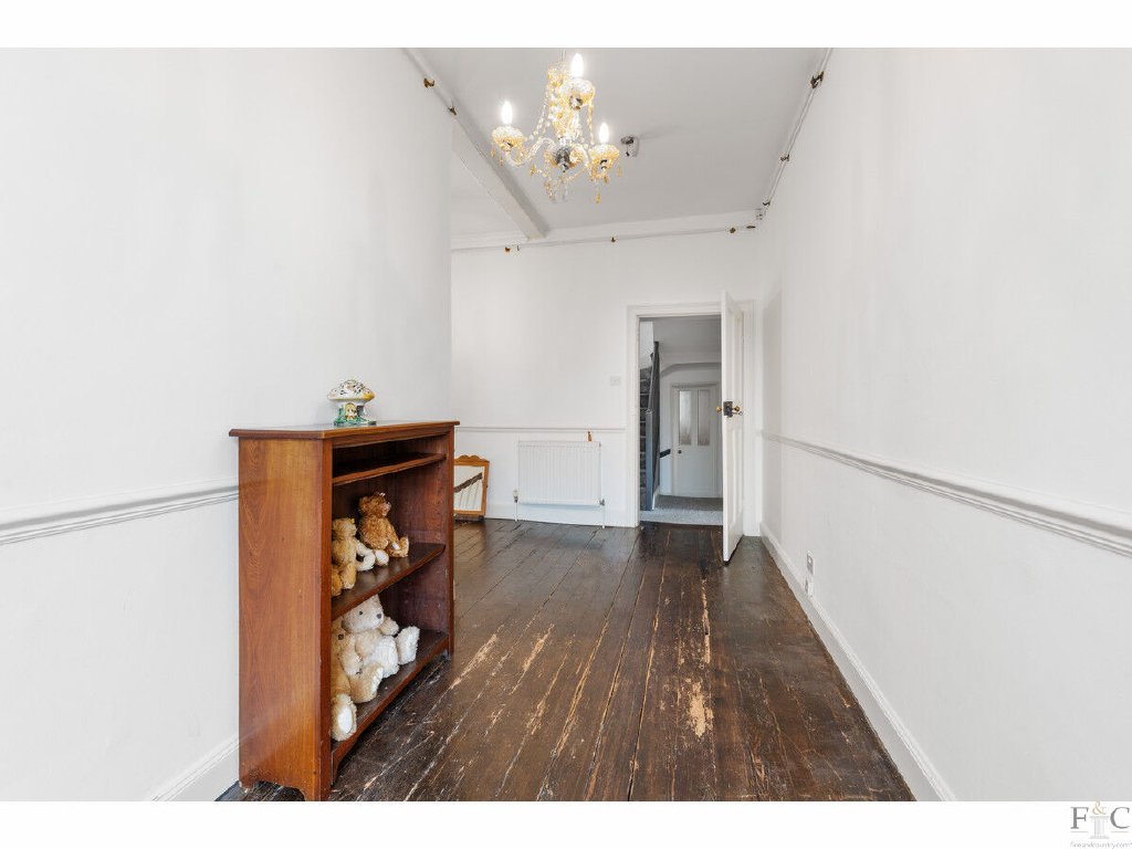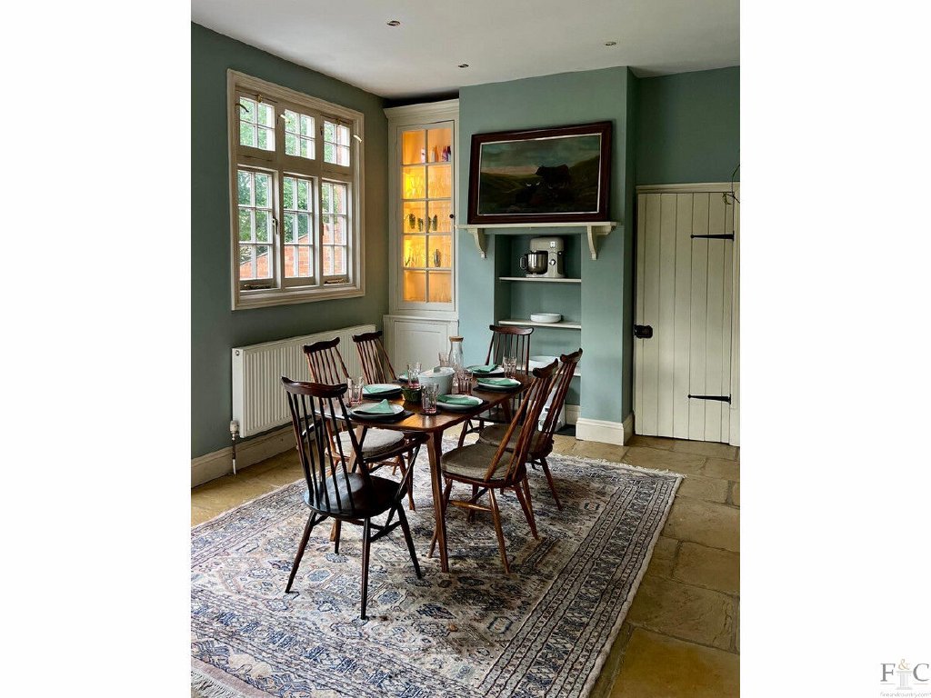 The snug is exactly that! It is across the hall from the original servant’s bells and is equipped with bespoke cabinetry surrounding an open cast iron fireplace. Showcasing original wooden boarding, a large sash window, dado rail and plate shelf, this room is brimming with character.