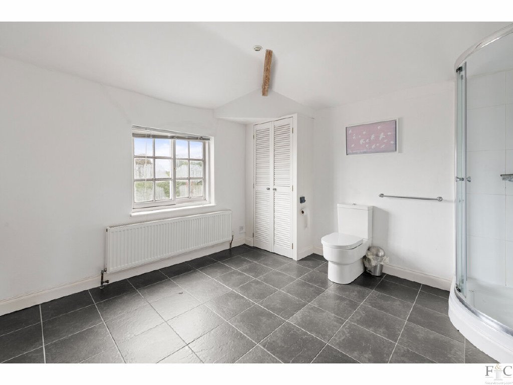 The family bathroom has a suite comprising of a free standing roll top bath to the side of its window, a walk-in shower with basin and toilet. Painted, wooden tongue and grove panelling covers half of the walls and there is a tiled floor. A separate cloakroom is next door with toilet and basin.