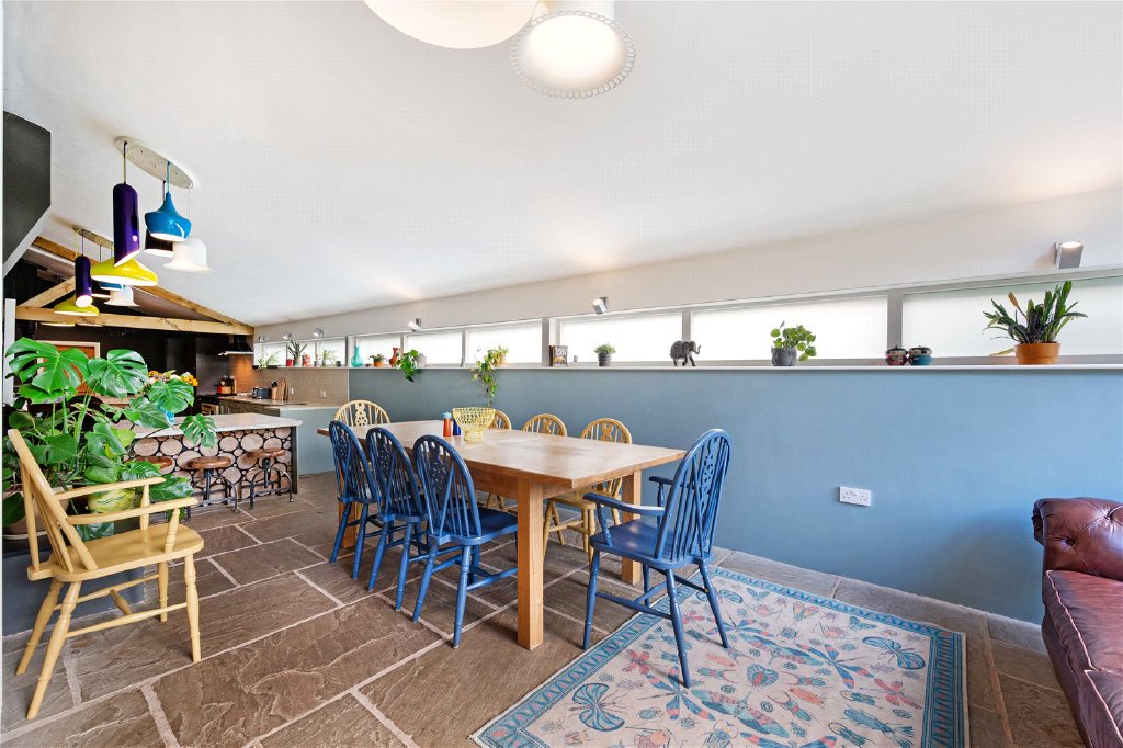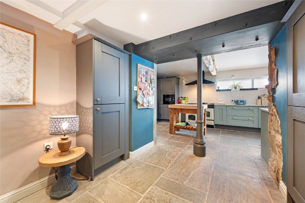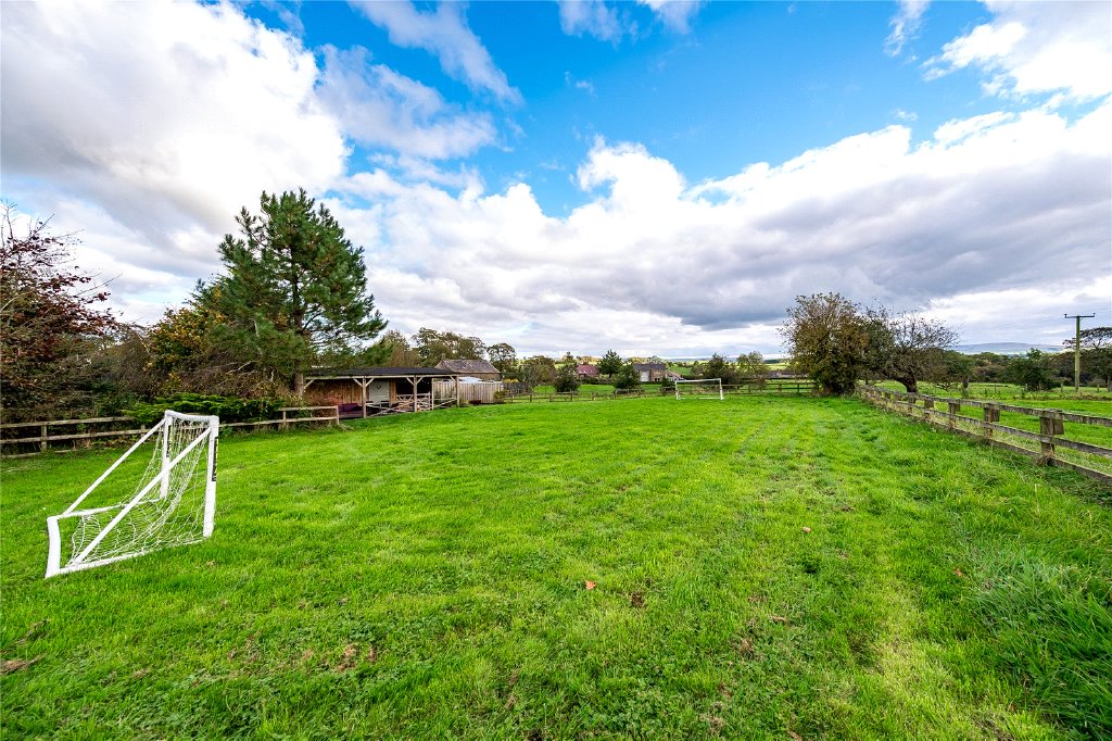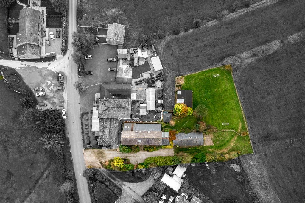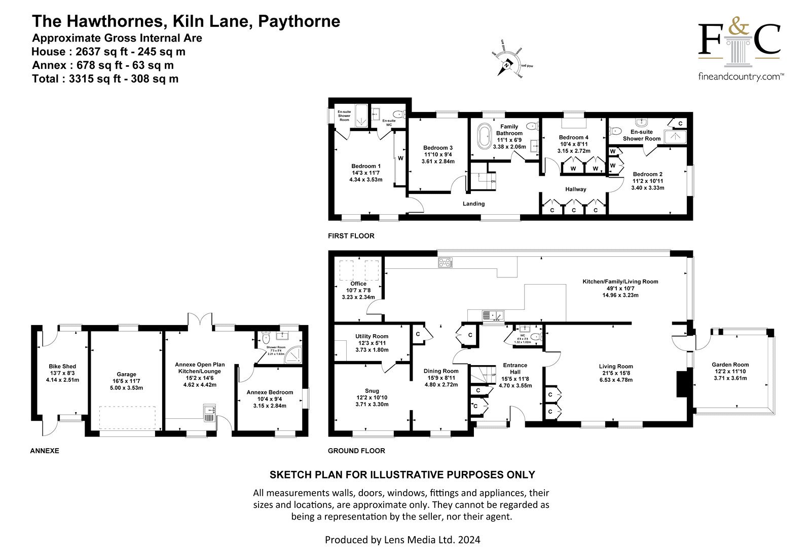 As you approach The Hawthorns from Kiln Lane, the property immediately impresses with its grand gates, opening onto a loose stone driveway that provides ample off-road parking for multiple vehicles. Stepping through the main entrance, you are welcomed into an elegant hall with a turn staircase leading to the first floor, complete with under-stair storage and a convenient W.C. The spacious family living room boasts continuity of the stunning flagged flooring that extends throughout the ground floor. A multi-fuel burner adds warmth and charm, and from here, you can access both the family kitchen and the particularly captivating garden room. The heart of the home, the expansive family living kitchen spans an impressive 50 feet. It is a beautifully appointed space with a range of integrated appliances, including a wine cooler, dishwasher, and a Rangemaster electric oven. The kitchen features two Rangemaster sink units and solid white granite worktops that complement the classic shaker-style cabinetry. A striking glass gable bathes the room in natural light, and a useful office space is conveniently situated just off the kitchen. Adjacent to the dining room is a delightful snug, which showcases a striking exposed stone wall, a feature echoed in several rooms on the ground floor. An internal door leads to the utility room, which houses plumbing for a washing machine and the Worcester floor-standing boiler.