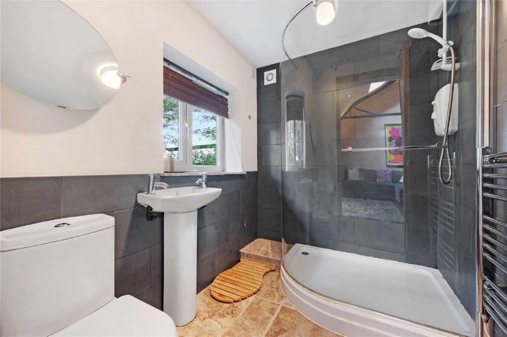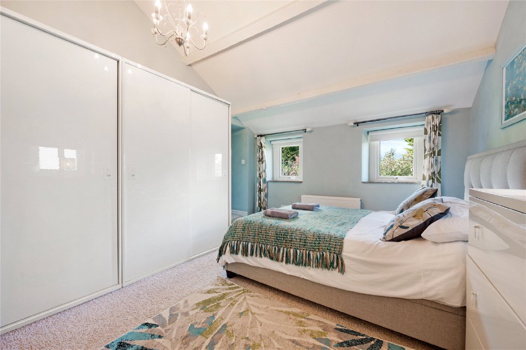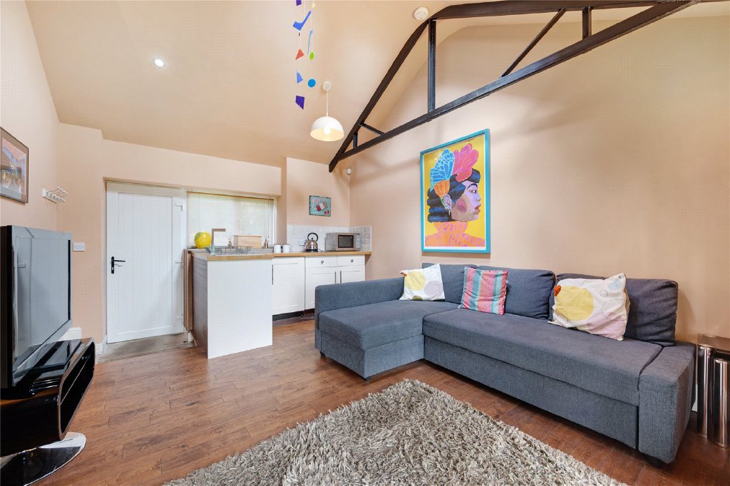 Externally, the property offers access to a separate annexe, divided by a bike shed and a single garage equipped with an electric up-and-over door and additional storage above. The annexe itself comprises an open-plan kitchen and living area with a multi-fuel burner, a separate shower room, and a double bedroom.