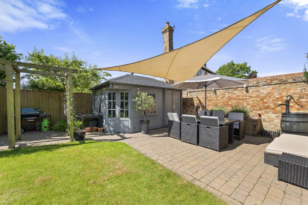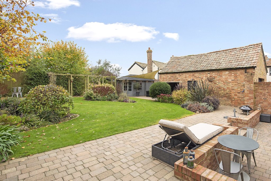 Outside, the south-facing garden offers a private oasis with block-paved seating, lush lawns, and a