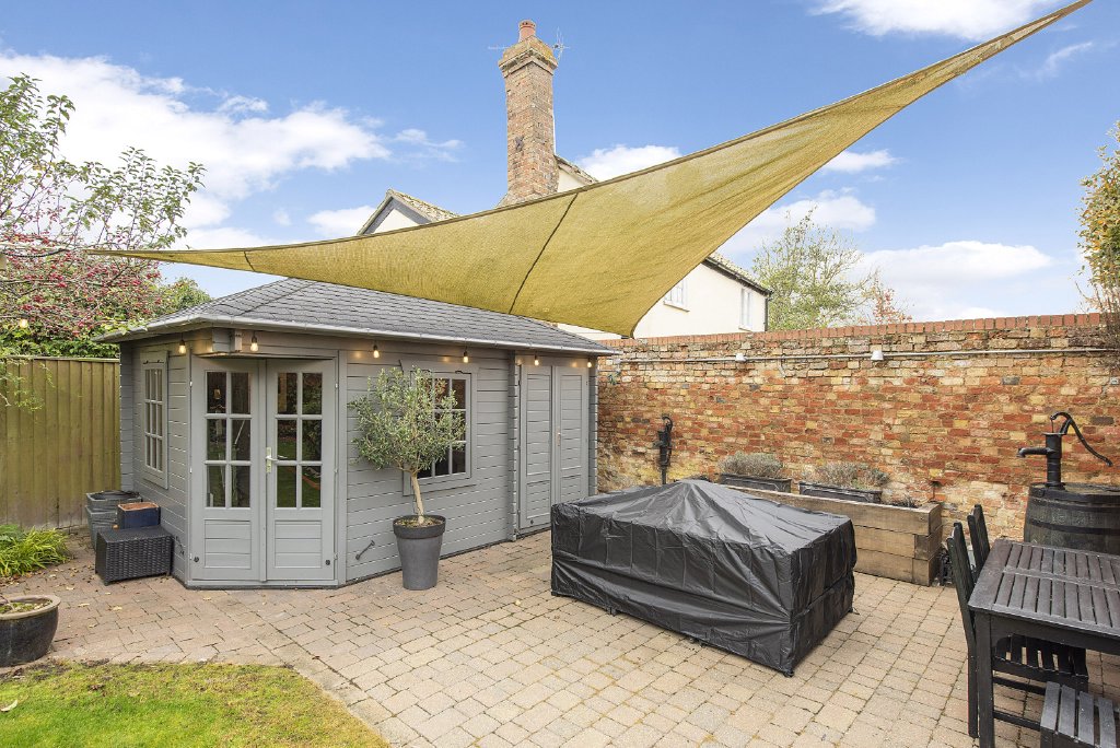 shed and a timber log cabin, currently used as a gym but adaptable for a home office, complete the