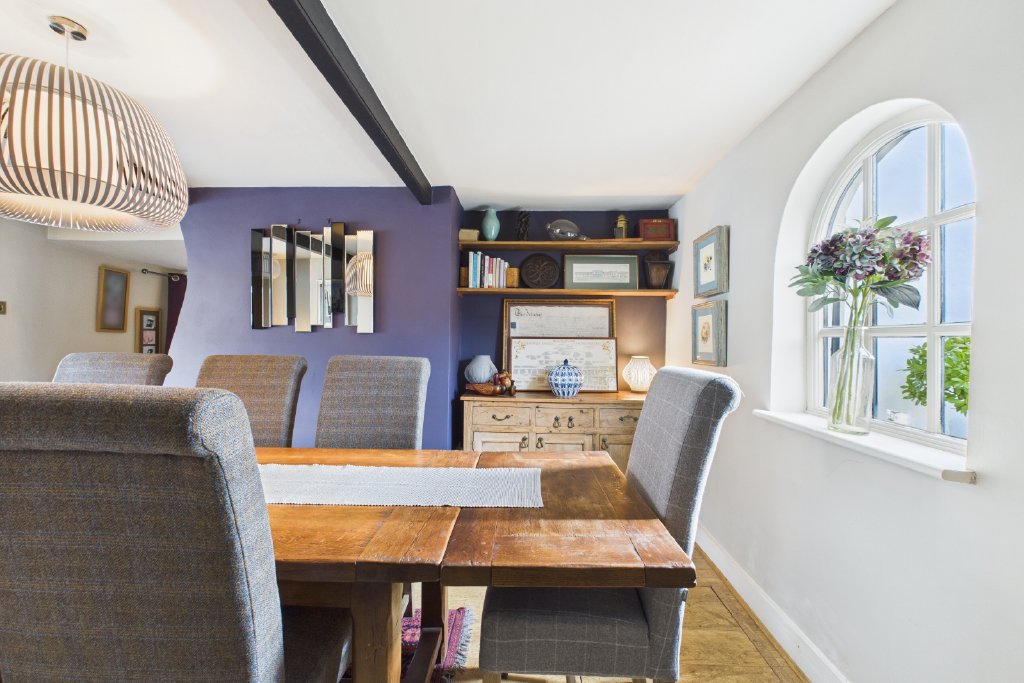 Additionally, the cosy yet expansive lounge features a dual-fuel stove and connects to a dining area that boasts a curved wall and a bay window, creating a delightful mix of charm and spaciousness.