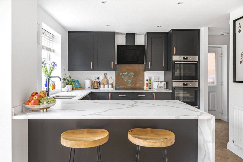 The kitchen/dining room is a standout feature of this property, offering a modern and stylish space. The kitchen features elegant cabinetry with copper handles, perfectly complemented by luxurious white Minerva worktops with a waterfall edge and integrated appliances. The dining area provides ample space for a large table and chairs, ideal for family gatherings or entertaining, with direct access to the private rear garden through the French doors.