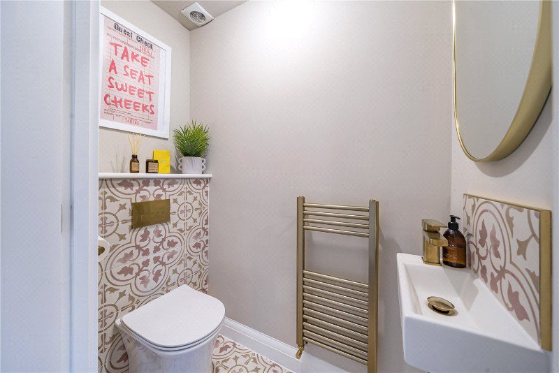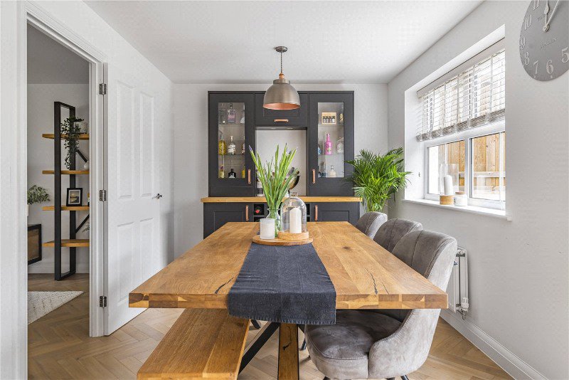 Upon entering the property, you are greeted by a bright and welcoming hallway featuring beautiful herringbone flooring that extends throughout most of the ground floor. The hallway provides access to a stylish downstairs W/C and a reception room currently used as a home office.