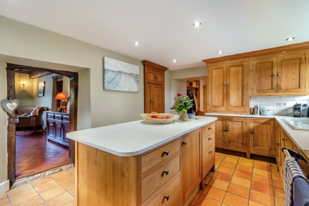 The quarry tiled floor and ceiling beams top and tail the space in period character and creates an intimate and inviting atmosphere within which to enjoy family meals and dinner parties sat around the substantial central table. An open double doorway leads into the country kitchen that effortlessly combines a traditional style with the modern appliances and storage - everything a cook requires with the stunning deep blue Aga a standout feature.