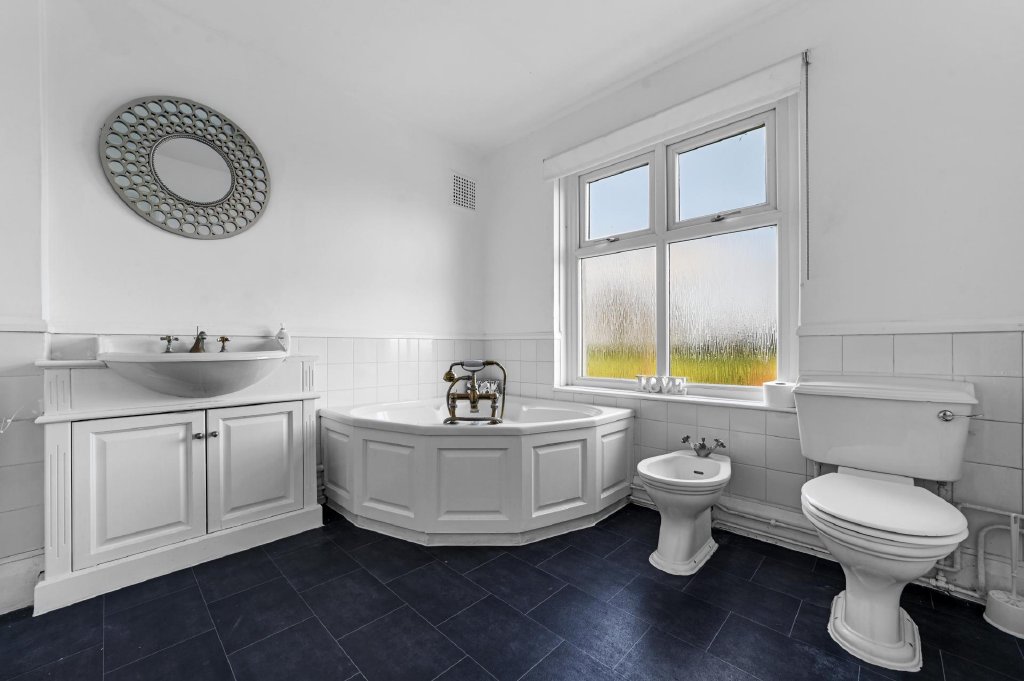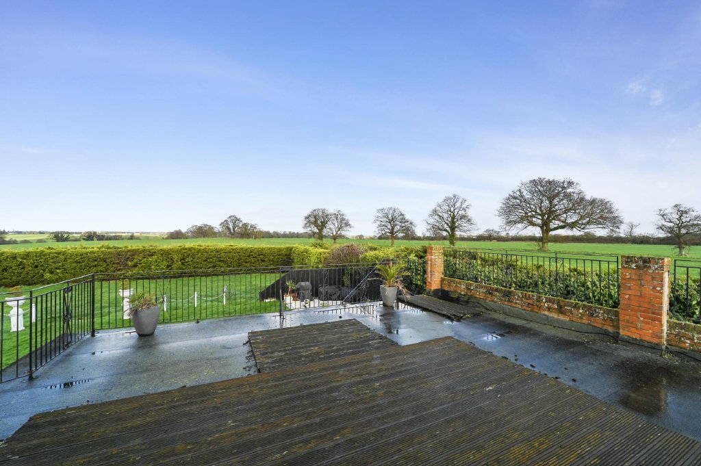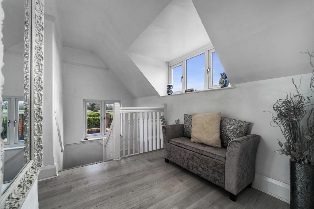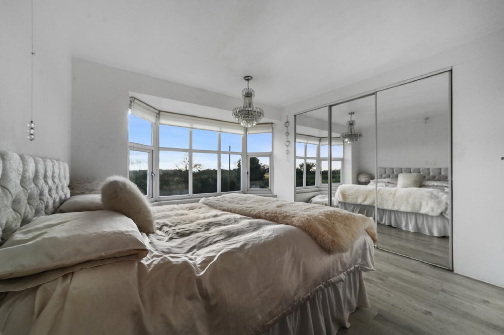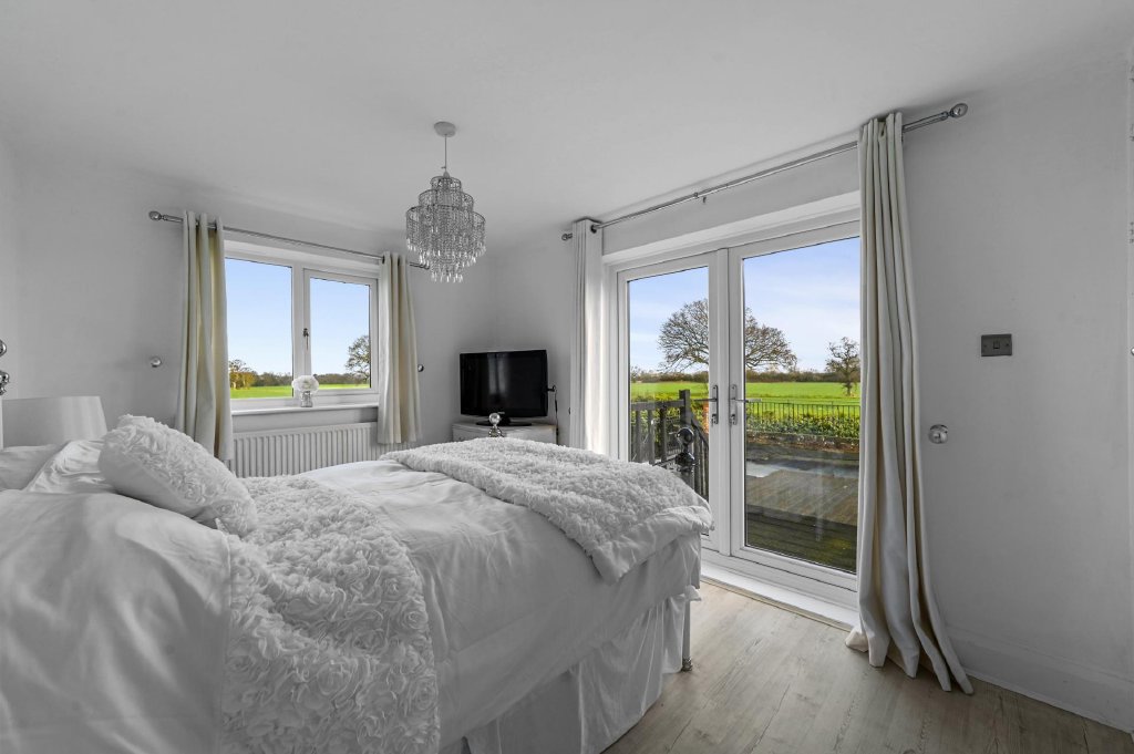Upstairs, the first floor reveals five generously proportioned double bedrooms, each enjoying far-reaching countryside views. The master suite is a true retreat, featuring an elegant bay window, fitted mirrored wardrobes, and a private en-suite. Bedroom Three is another standout, with dual-aspect windows and a patio door opening onto a spacious roof terrace, a wonderful spot to unwind and take in the scenic surroundings. The remaining bedrooms offer ample space for family and guests, ensuring comfort and versatility throughout.