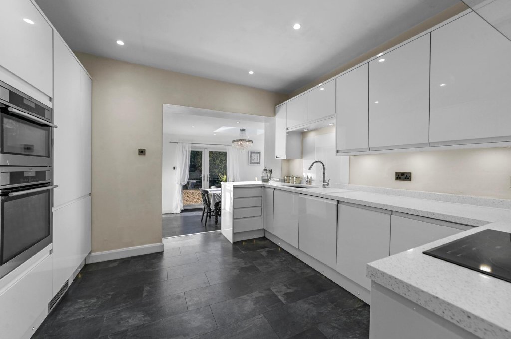 The sleek, modern kitchen impresses with high-gloss cabinetry and integrated appliances, flowing seamlessly into the breakfast room where a skylight and dual-aspect windows bathe the space in natural light, the perfect setting for relaxed family dining.