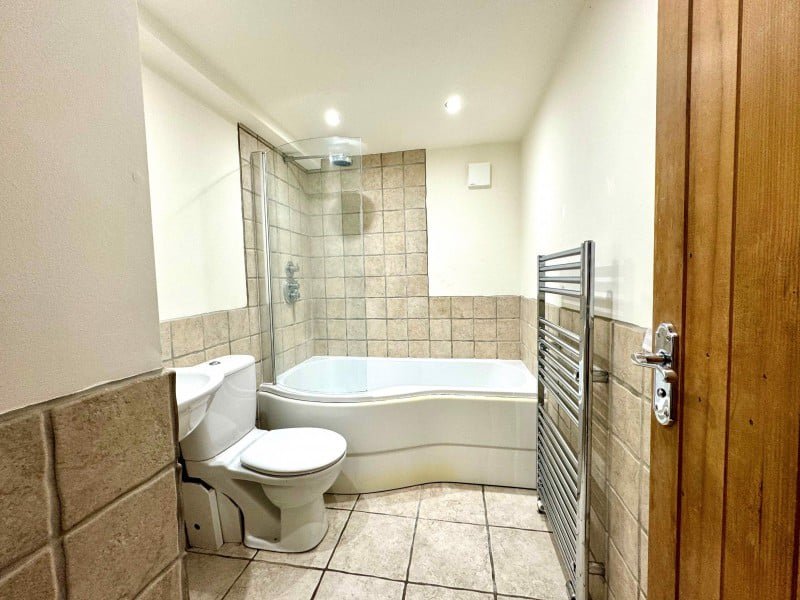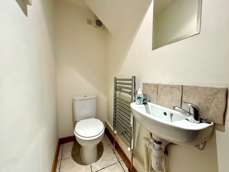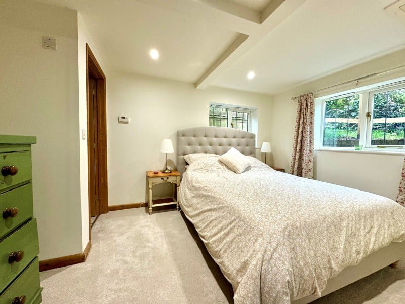 The ground floor features a spacious principal double bedroom with a contemporary en-suite, a second double bedroom with built-in wardrobe storage, and a family shower room. Stairs lead to the first floor, where the kitchen/dining room has direct access to the rear garden. A W.C. is located off the hall, which also connects to the generous sitting room, boasting a vaulted ceiling and an impressive window that enhances the space and natural light.
