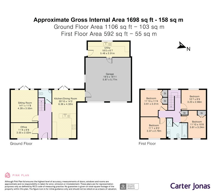 The ground floor provides a welcoming entrance hall from which all rooms radiate. There is a superbly refitted kitchen/dining room with Crittall style square paned french doors and side panels leading to the rear garden. The cosy sitting room also has the same doors and winds to the rear garden. There is also a study with built in cupboards a utility and a cloakroom on the ground floor.