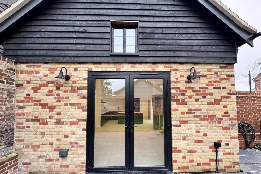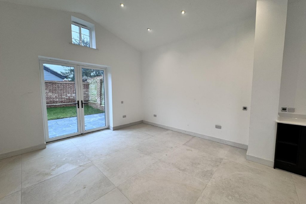 STEP INSIDE Upon entering, you are welcomed into a spacious hallway that provides access to all areas of the home. To the left, you'll find the open-plan kitchen and living room which is truly the heart of the home. This stunning space boasts high vaulted ceilings, French doors opening onto the garden, and an additional window above, flooding the room with natural light. The kitchen features a high-quality design, complete with integrated appliances, perfect for modern living.