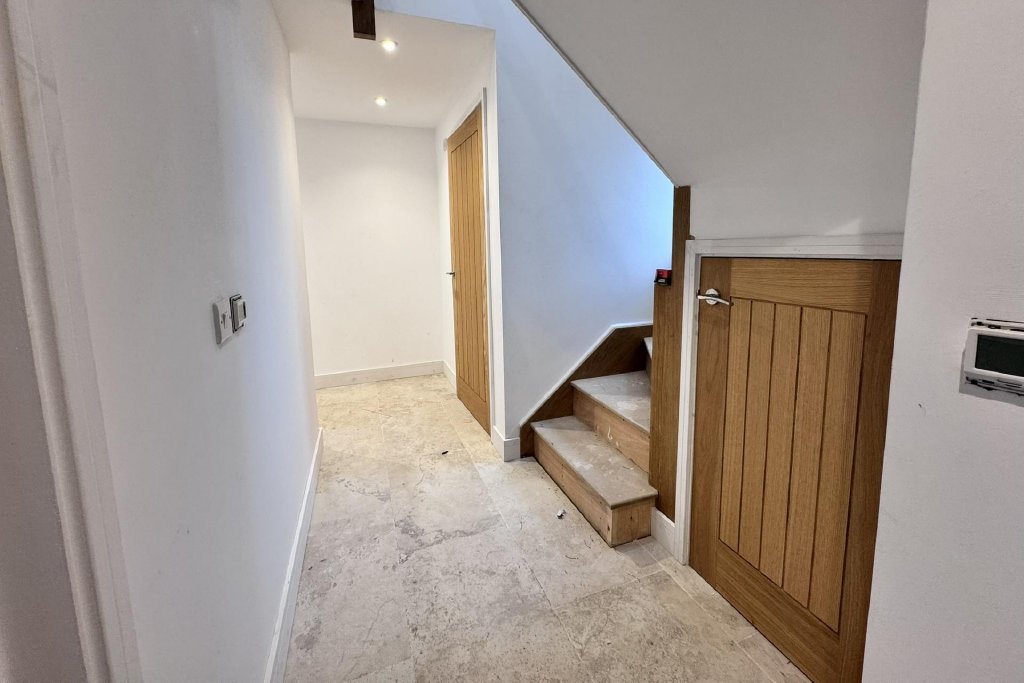 With UPVC entrance door and UPVC sealed unit double glazed side full height window; staircase two first floor; under stairs storage cupboard.