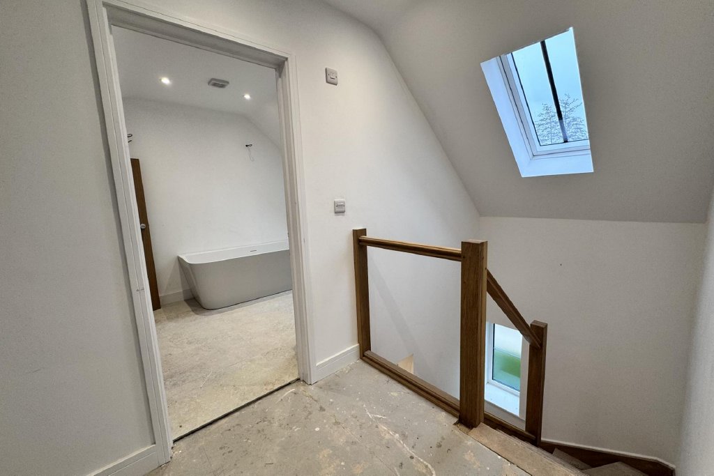 Heading upstairs, the master suite is accessed via a spacious landing illuminated by a large Velux window. The master bedroom itself is a bright and airy double room, offering eaves storage and a Velux window that brings in even more natural light. The ensuite is both well-proportioned and practical, featuring an airing cupboard and another Velux window to complete the space.