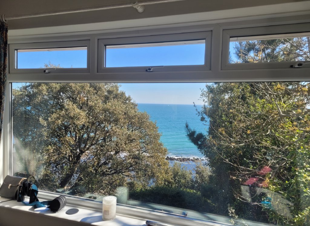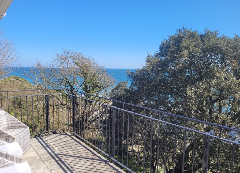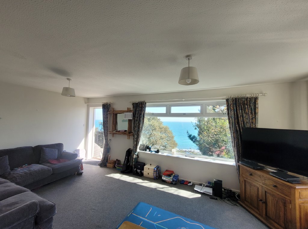 Partially open to the kitchen, the sitting room is a highlight of the home. This spacious dual-aspect room is designed to make the most of the incredible sea views. Large windows frame the stunning scenery, and there is direct access onto the balcony, where there is ample space for a dining table. This outdoor area is ideal for al fresco dining or simply unwinding while admiring the breathtaking views over Steephill Cove and the English Channel.