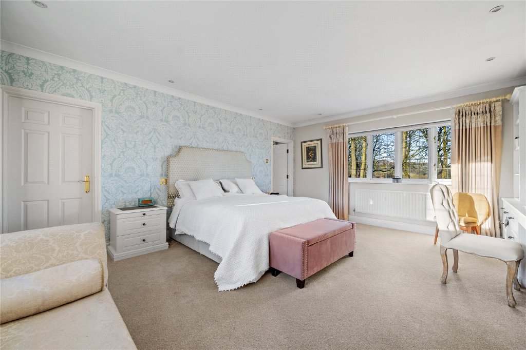 As you step inside, you are greeted by a welcoming entrance hallway giving access to the guest W.C./Cloaks room, a spacious dual aspect light and airy lounge with a feature stone fireplace and French doors leading out onto the patio area, a second sitting room with a fully fitted media wall, a study with built in cupboards and shelving. The fully-fitted kitchen is a chef's dream with high-end integrated appliances, marble work tops, a separate dining area perfect for entertaining guests and a further living space, making this the ideal open space for the whole family to congregate and enjoy spending time together. Leading off the kitchen is a separate utility/boot room and the orangery with the original stone walls, stunning far reaching views and French doors leading out onto the garden.