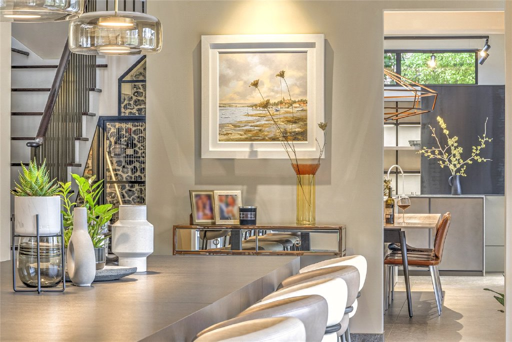 The living spaces are designed to impress and entertain. The dining room features a chic bar area with Leicht Bossa walnut doors and Dekton accents which offers the perfect setting for hosting, while the 200-bottle wine cellar, handcrafted by Phoenix Metalcraft, combines functionality with artistry, featuring a hand-laid flint wall and optimal climate control.