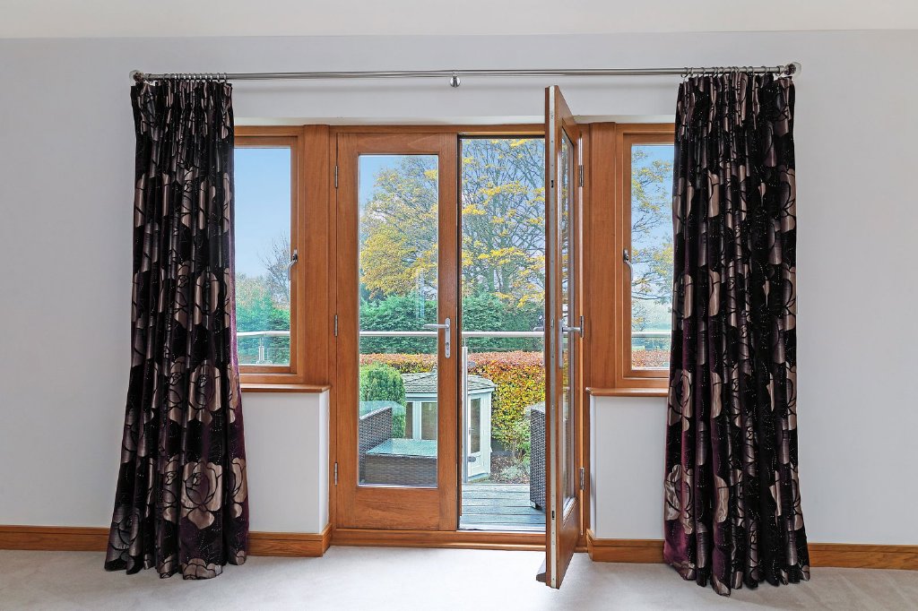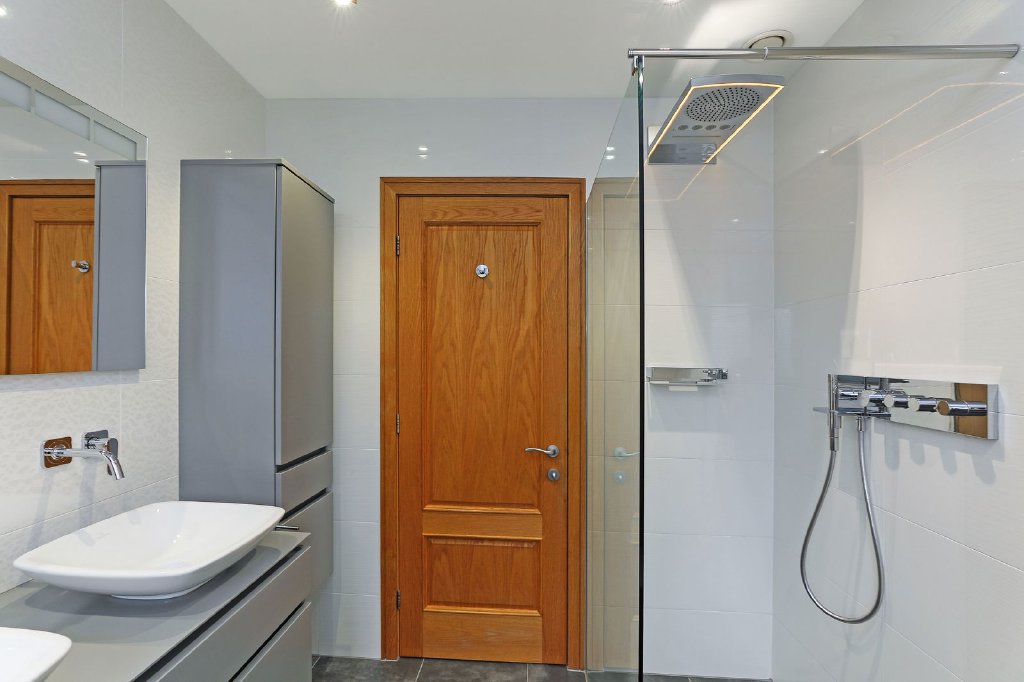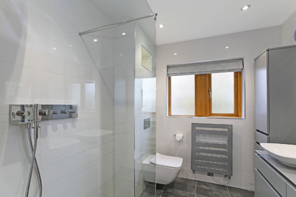 The principal bedroom suite is impressive from all viewpoints, the bedroom offering exceptional accommodation exposed into the apex of the building with a window to the front offering a glimpse of surrounding countryside. French doors to the rear sit in between windows and open on to a decked balcony with LED up lighting and a stainless steel and glass balustrade, commanding a delightful outlook over the gardens and adjoining countryside beyond. A separate dressing room would make a fifth bedroom or nursery, is positioned to the rear aspect of the property with a window commanding long distance views and fitted with wardrobes to two walls with sliding doors. The en-suite shower room presents furniture by Villeroy and Bosch, has a wet-room style shower, a wall hung W.C and twin wash hand basins with vanity draws and cupboards beneath. This room has complementary tiling to the walls and floor, a heated towel radiator and an opaque window to the front aspect.