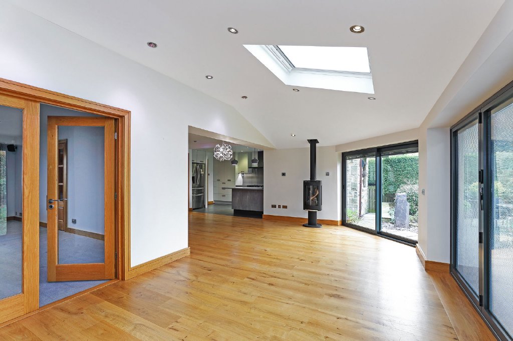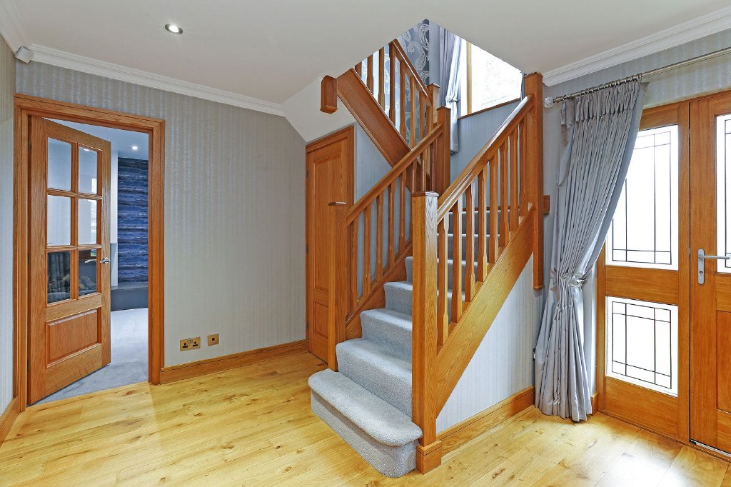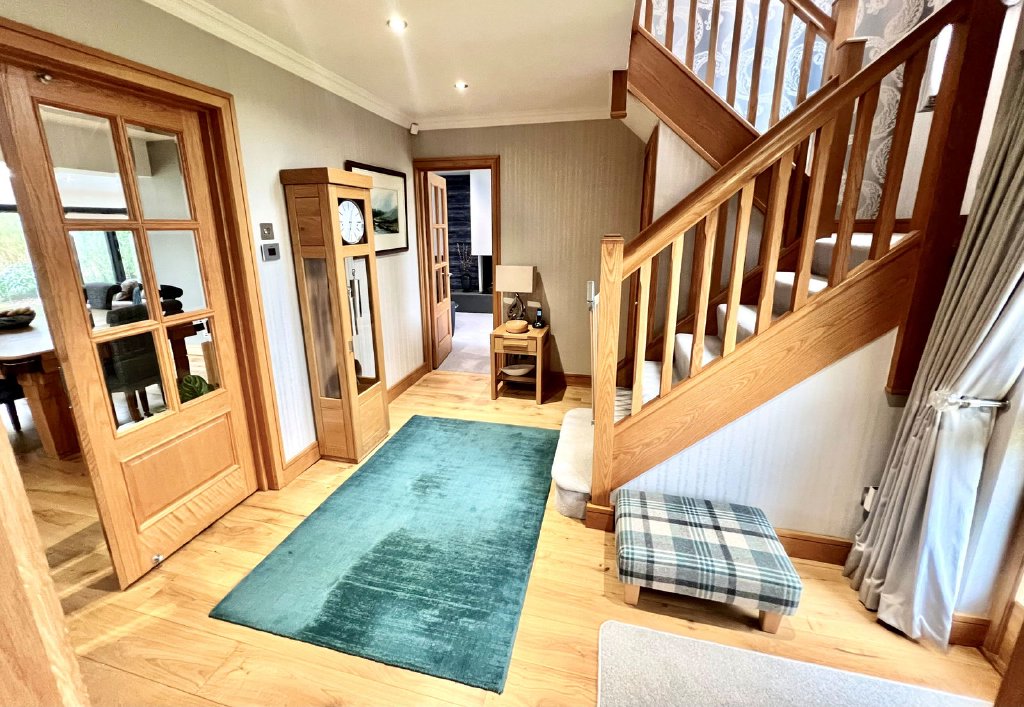 A solid oak entrance door opens into the reception hall which offers an impressive introduction to the home; a bespoke oak spindled staircase with an arch top window overlooking the half landing ensuring an abundance of natural light indoors. The hallway has an engineered oak floor, a useful storage cupboard beneath the stairs and access to a cloakroom presented with a modern suite finished in white consisting of a wall hung W.C, and a wash and basin with cupboard beneath, complemented by tiling to the walls and floor, an opaque window and an engineered oak floor.