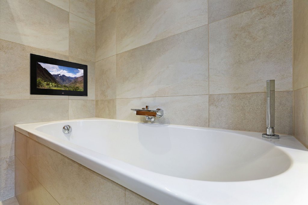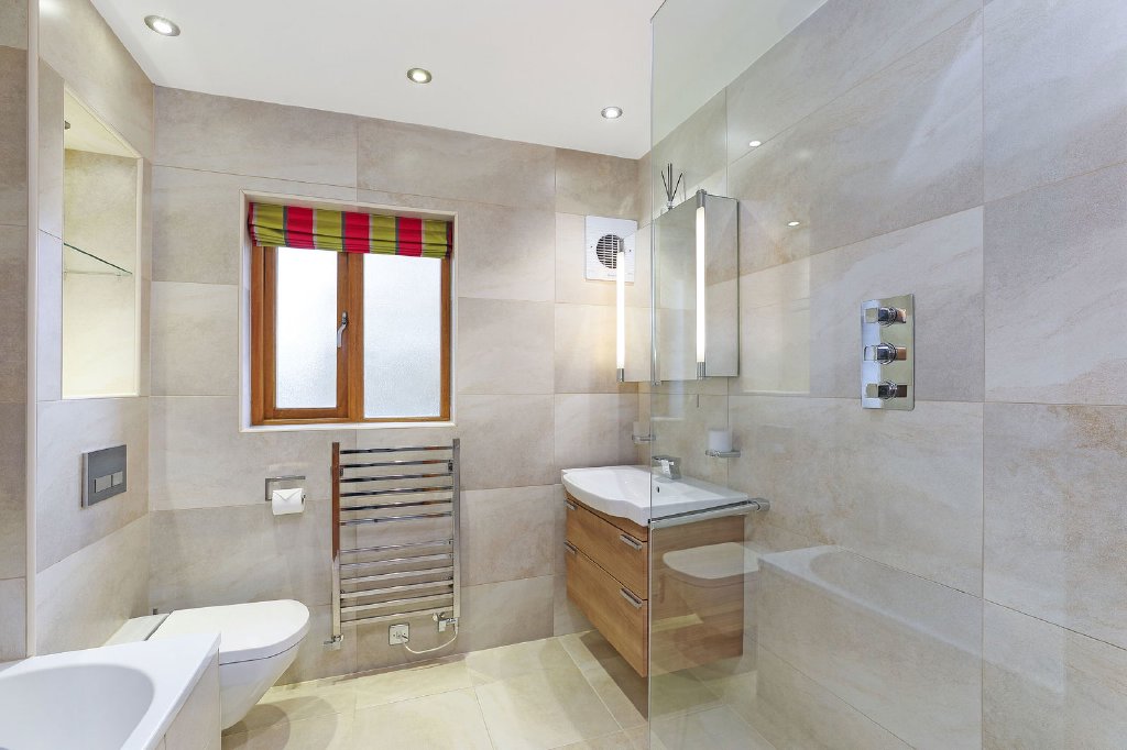 The family bathroom presents a floating wash hand basin with vanity draws beneath, a wet-room style shower, a tiled panelled bath and a wall hung W.C. The room is complemented by tiling to the walls and floor, a heated Chrome towel radiator, a frosted window and Aqua vision television to one wall.