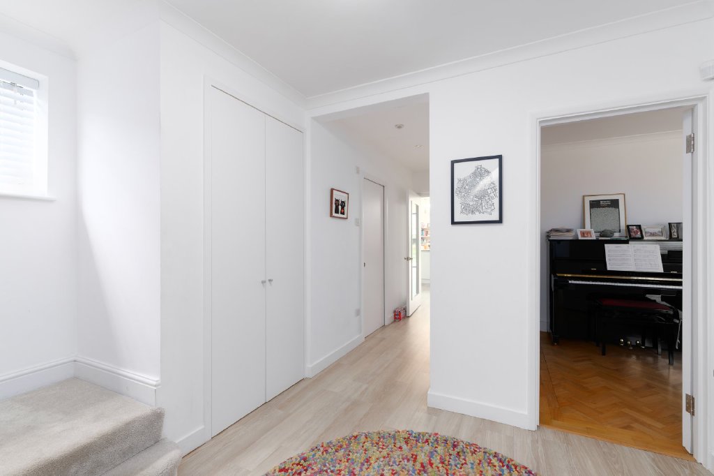 The house is set back from the road and entered into a welcoming entrance hall. Lovely light grey Karndean flooring leads you through to the back of the house, which has been extended and opened up to create a fantastic entertaining space. Floor-to-ceiling glass sliding doors cover two sides and open out to the rear garden. This room is filled with natural light from the doors and large roof lights. The kitchen is made up of white high-gloss units with integrated appliances and a granite work surface. There is a living room with attractive parquet flooring and a wood-burning stove, a separate study/playroom, and a shower room and utility cupboard off the hall which houses the underfloor heating manifold, boiler, washing machine, and tumble dryer. Upstairs are three double bedrooms, one of which has an en-suite shower room and another with access to a spacious roof terrace. There is a further family bathroom off the landing. Planning permission has now been approved for a loft conversion to create a further en-suite bedroom. The impressive rear garden is mainly laid to lawn with a patio out from the house and is completely surrounded by mature trees.