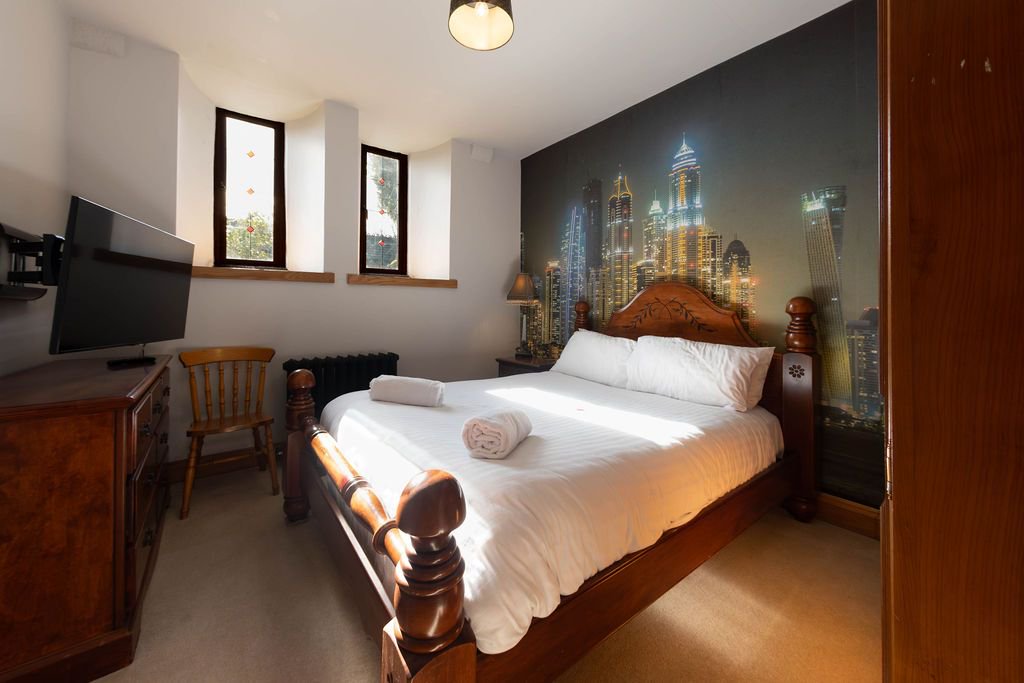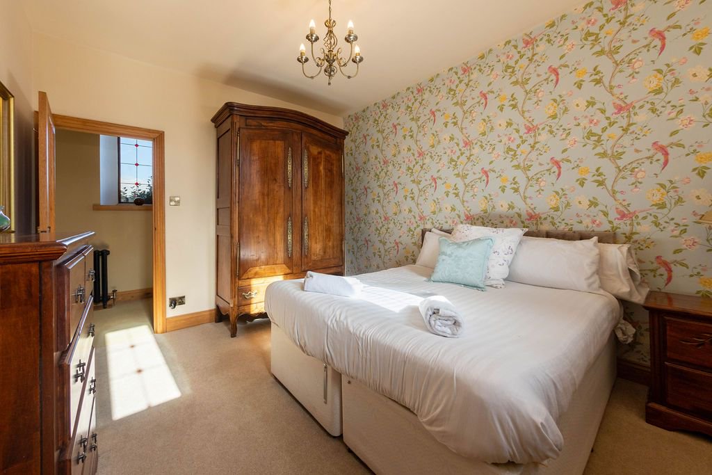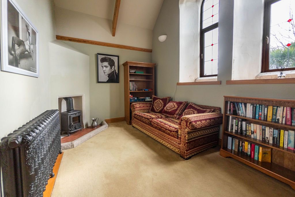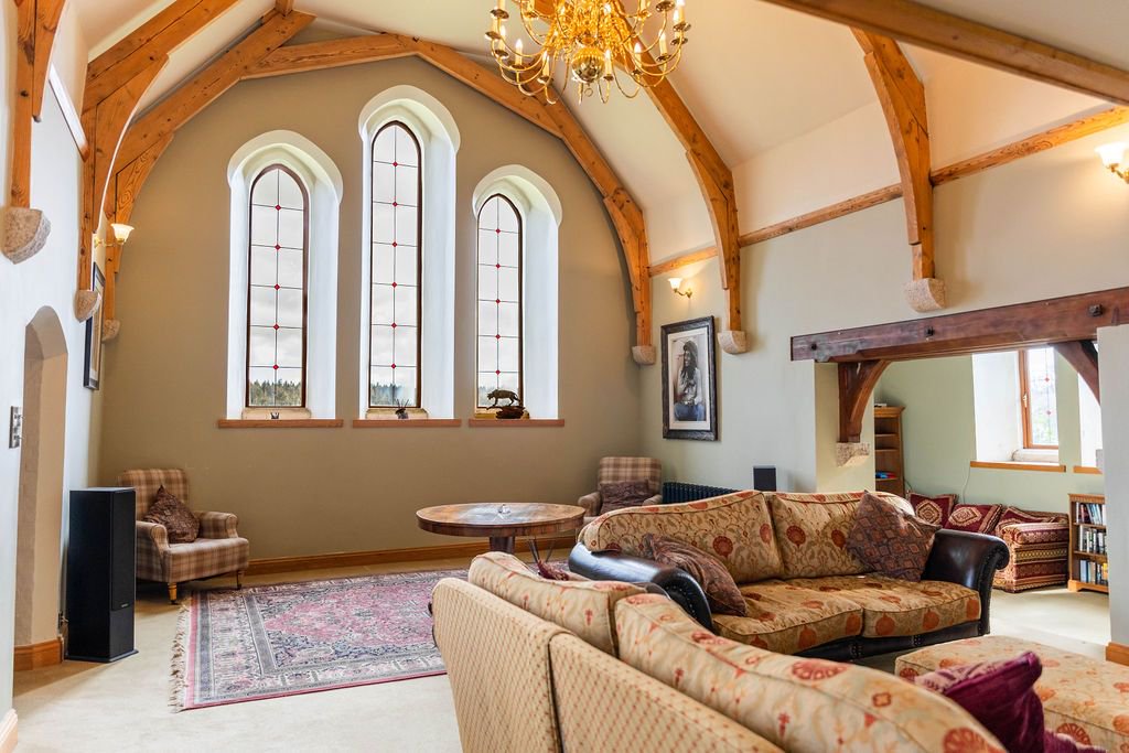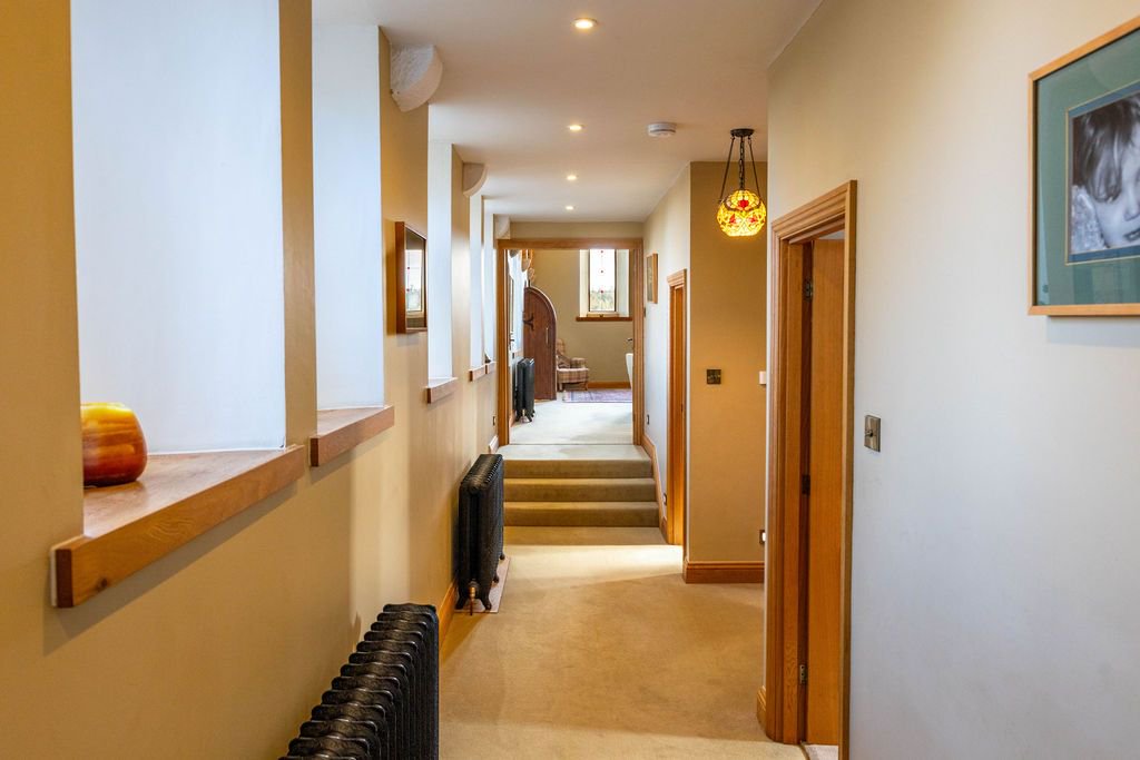 The original staircase leads to the ground floor, where a grand sitting room showcases high ceilings, exposed granite, and large windows, creating an elegant and inviting space. Along the hallway are two double bedrooms and a family shower room. At the end of the hallway, an original church door opens to the front of the property. Adding to its charm, the house even features a working church bell, which you’re welcome to try when you visit!
