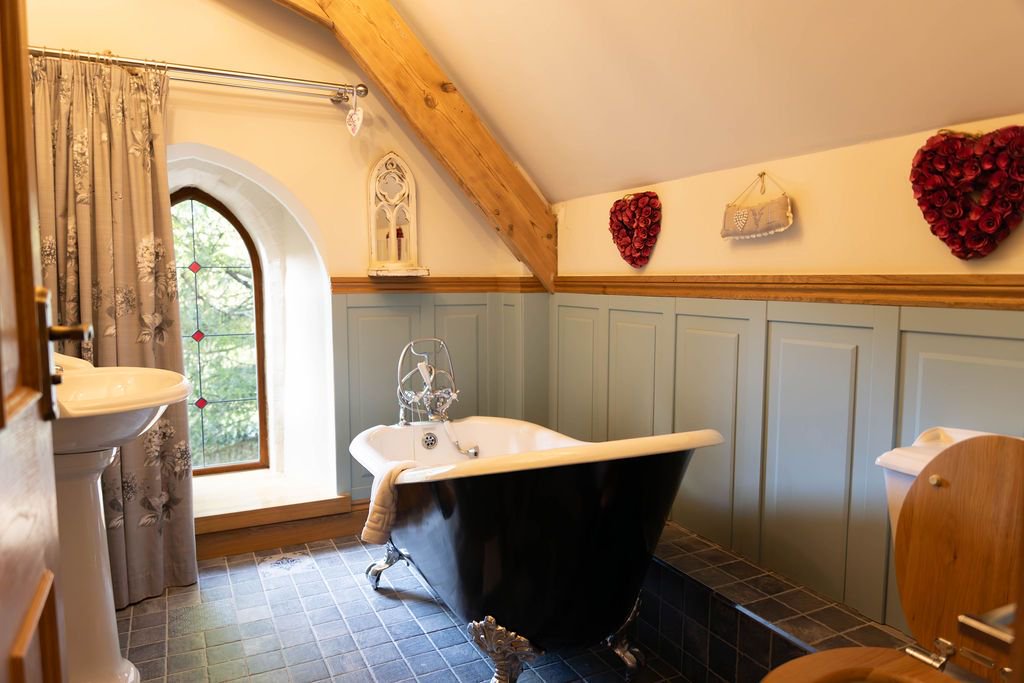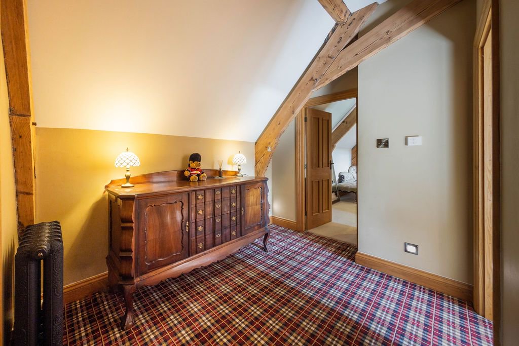 The first floor includes a bedroom and a stylish bathroom featuring a clawfoot bath, while the master suite offers an en-suite bathroom and his-and-hers built-in wardrobes. A large picture window overlooks the sitting room, framing breathtaking valley views that stretch as far as the River Tamar.