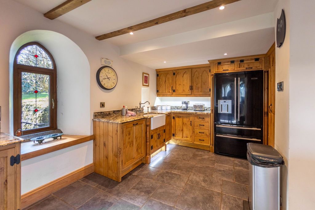 On the lower ground floor, the spacious kitchen/dining room offers ample space for entertaining, with stunning valley views, a wood burner, and original features such as exposed beams and granite window surrounds. This level also includes a plant room, W.C., and a handy boot room.