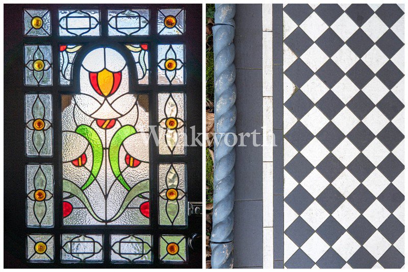 A beautiful stained-glass front door opens into an impressive entrance hall with tessellated tiled flooring, a monk's bench, and a cast iron fireplace. A door at the end of the hall provides convenient side access to the property.
