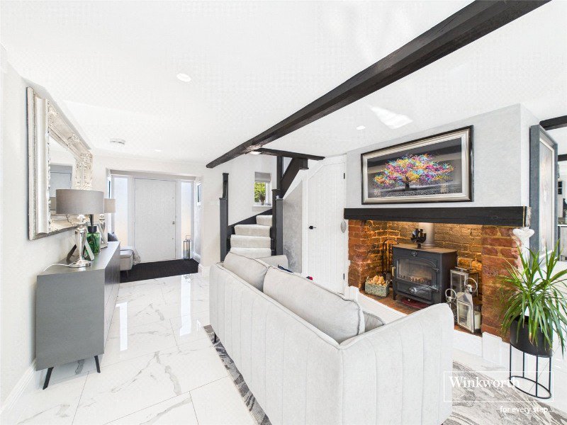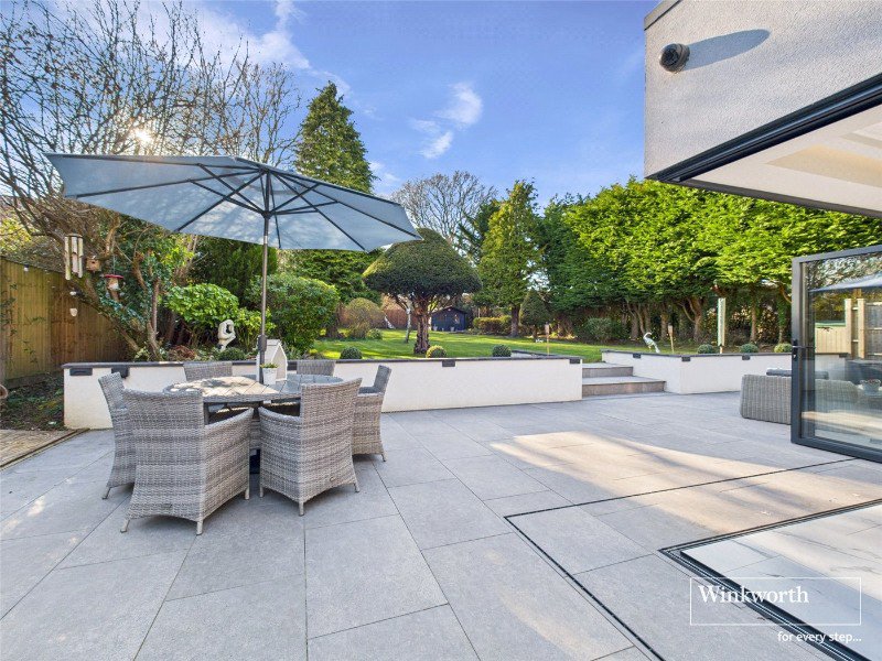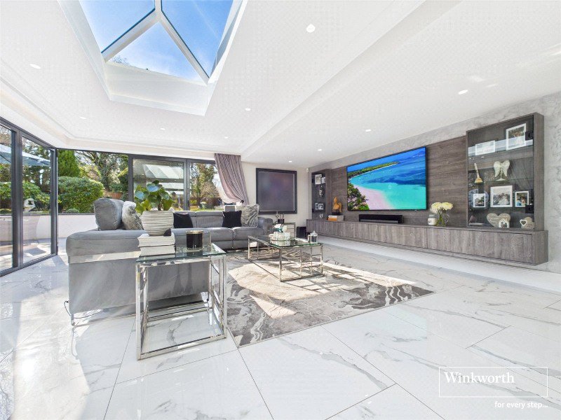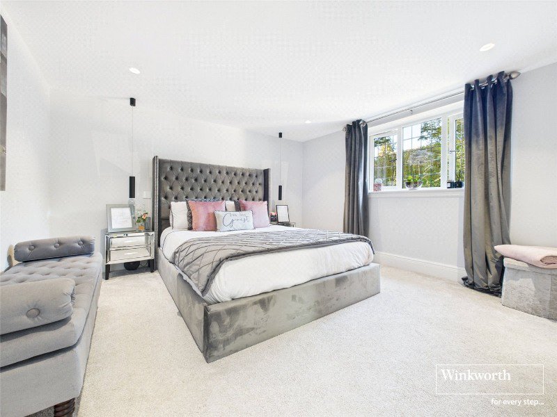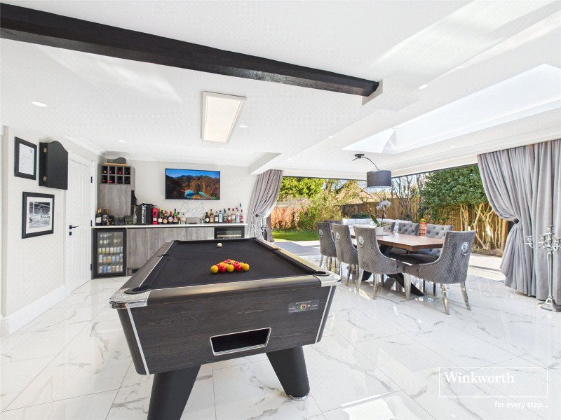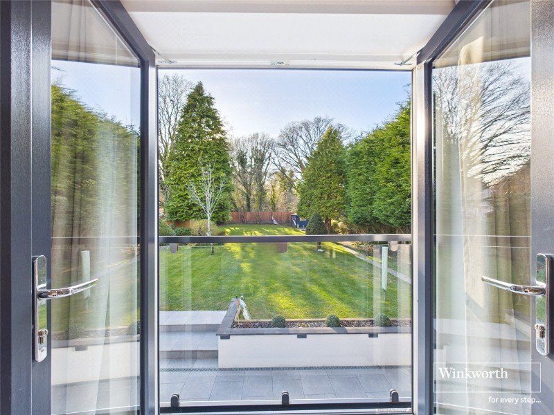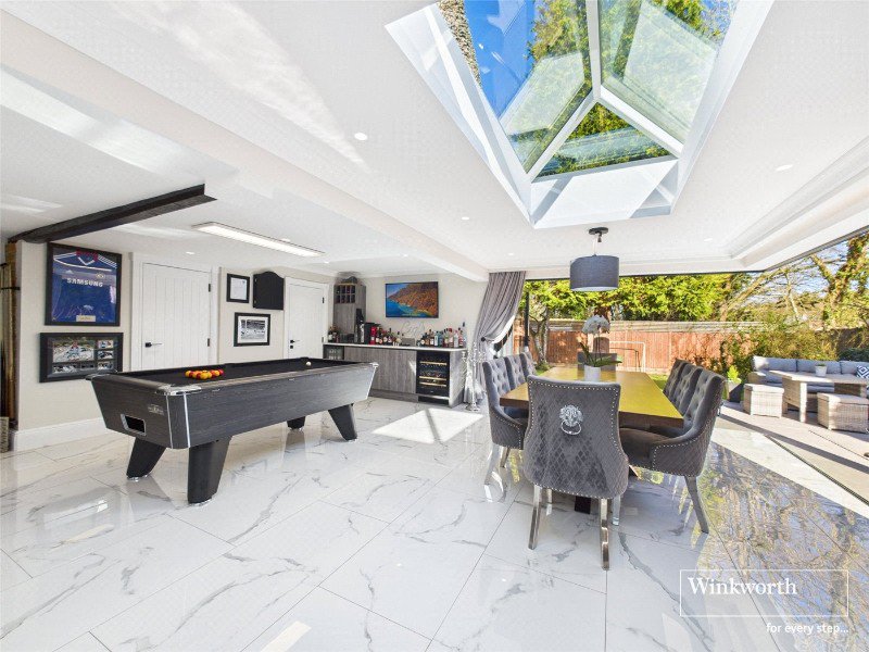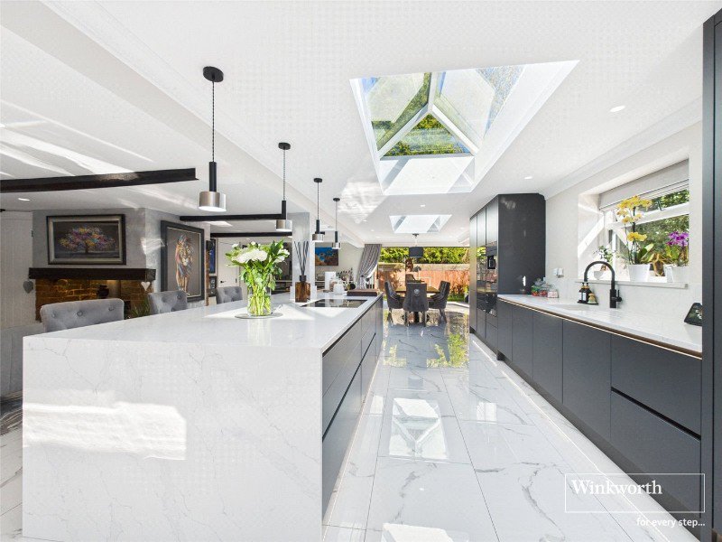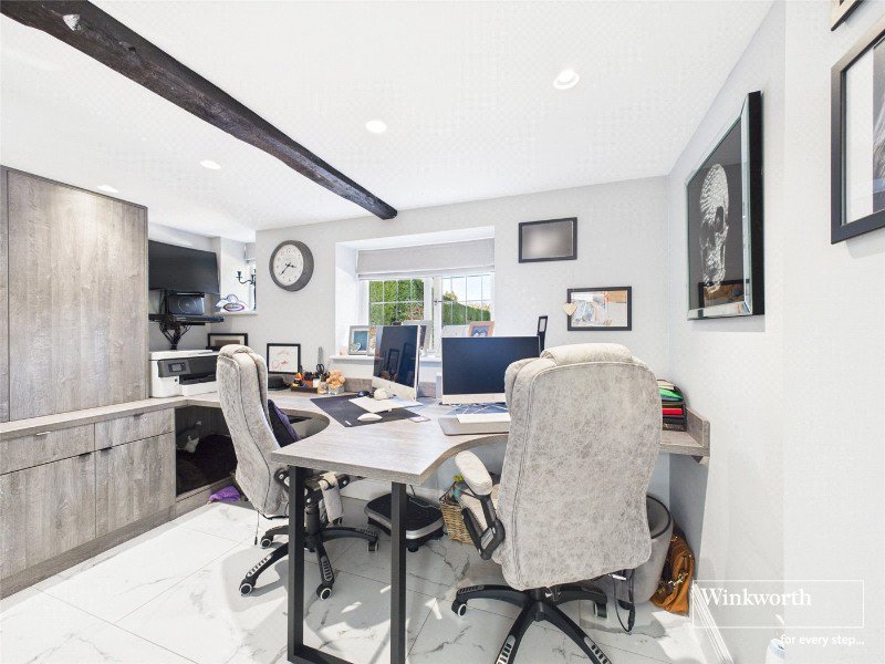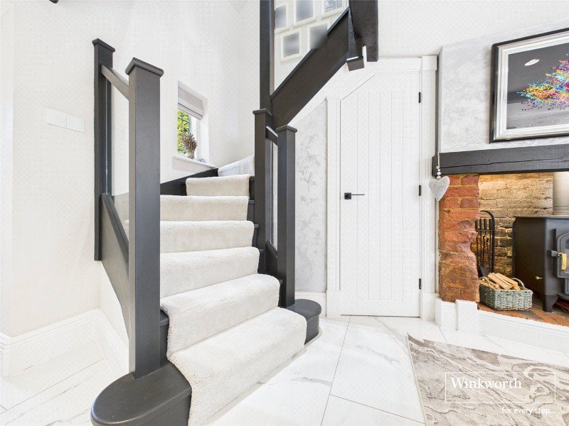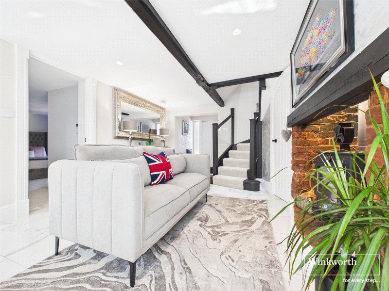 The entrance opens into a welcoming lobby area that leads to a cosy snug, featuring an exposed brick fireplace and a log burner, providing a warm, inviting atmosphere. The open-plan living space is expansive and flows seamlessly from the snug to the high-specification kitchen, complete with a striking central island featuring a “waterfall” stone worksurface. The kitchen is equipped with premium Miele appliances, including twin ovens, coffee machine, steamer, microwave, full-size fridge and freezer, and an induction hob with an integrated extractor. An under-worktop mounted sink with a Quooker hot water tap adds to the practicality and modernity of the space. Adjacent to the kitchen is a lounge, with a bespoke, pillarless bi-folding door set that opens up to the patio and garden, offering a perfect space for both relaxation and entertaining. To the left of the kitchen is the generous dining and entertaining area, which also benefits from another set of bi-folding doors, creating a seamless connection to the outdoor space. This floor also features a utility room with WC, a separate fully fitted study with a front aspect, and a spacious ground-floor bedroom with en-suite shower room. Underfloor heating runs throughout the entire ground floor, ensuring comfort and warmth throughout.