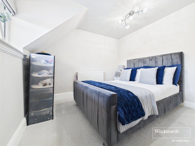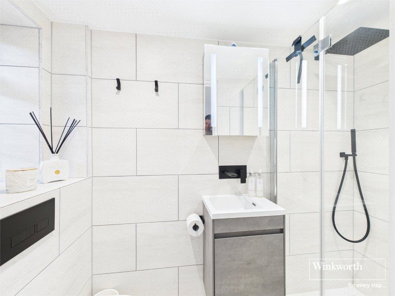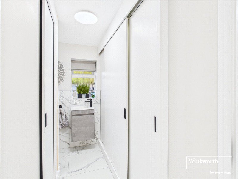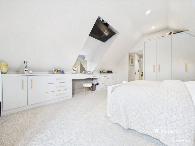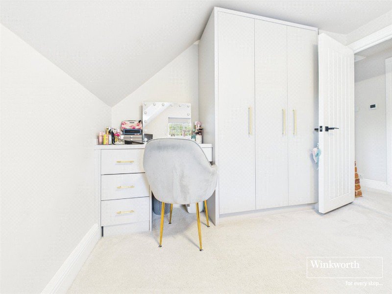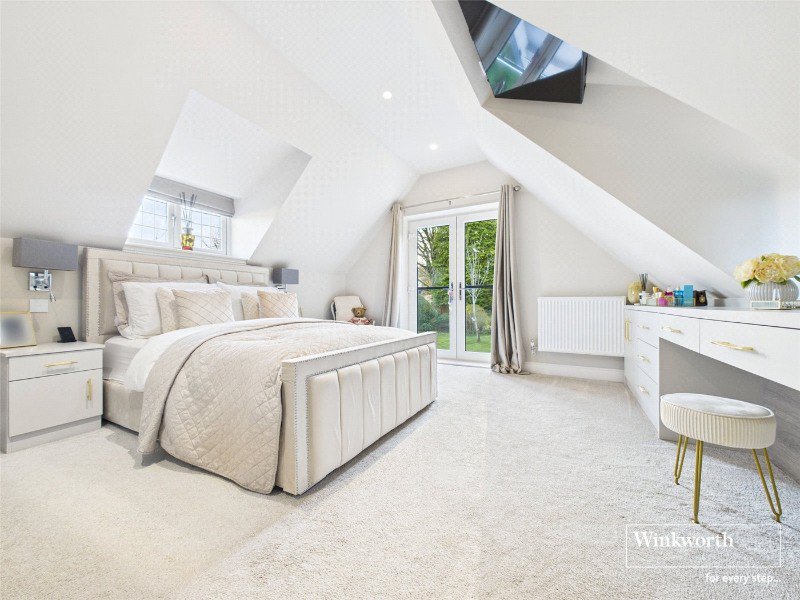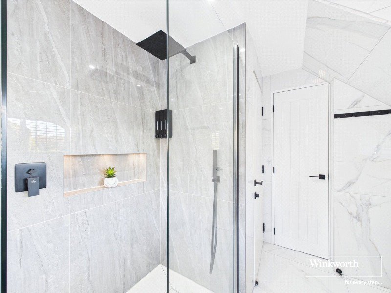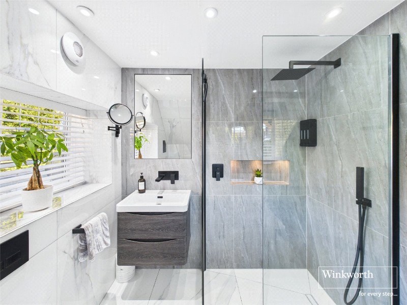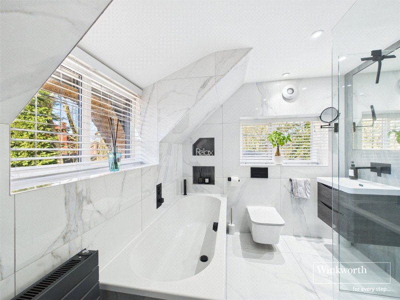 Upstairs, the principal bedroom is a luxurious triple-aspect suite with fitted wardrobes and a large dressing table. The en-suite bathroom is fully tiled and includes a generous walk-in shower, WC, and integrated vanity unit. Two additional double bedrooms are also on the first floor, each with fitted wardrobes, with bedroom two enjoying dual aspect windows offering views of both the rear and side gardens. A high-specification family bathroom, complete with a separate shower and bath, serves these rooms.
