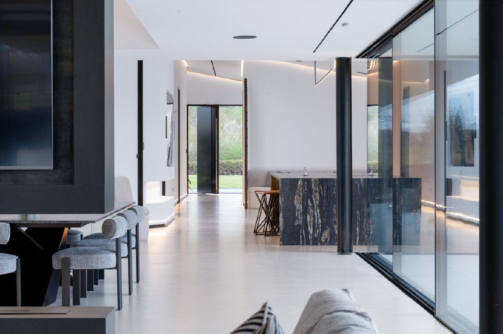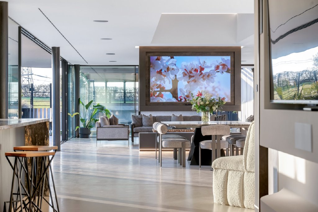 The living space continues into a dining area and additional sitting area, both of which feature a central media wall. Numerous full-height windows offer easy access to the outdoors, making this space ideal for entertaining all year round.