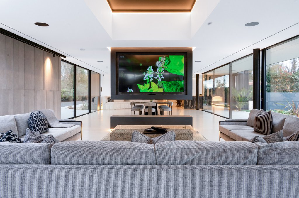 For entertainment, the home includes a state-of-the-art media room with a 100-inch television, offering an exceptional viewing experience for movie nights or sporting events, complemented by an advanced AV system that makes every moment unforgettable.