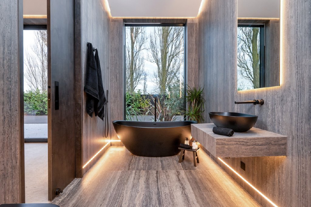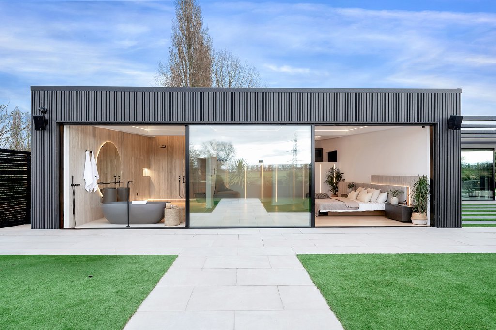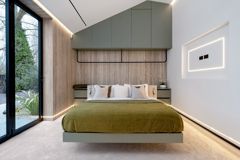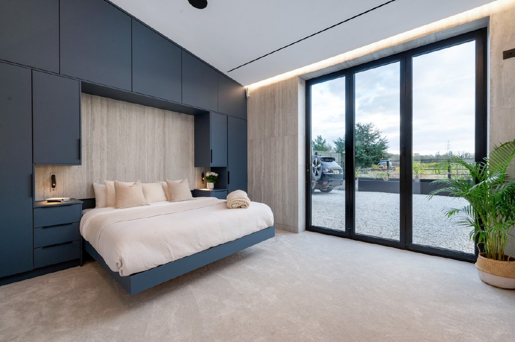 The fifth bedroom is currently configured as a home gym, with a fully glazed elevation and bifolding doors that open to the outdoors, perfect for fitness enthusiasts. This versatile space also includes luxurious en-suite facilities.