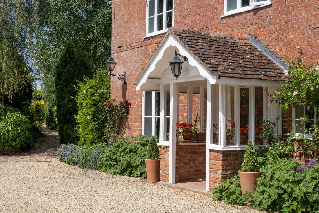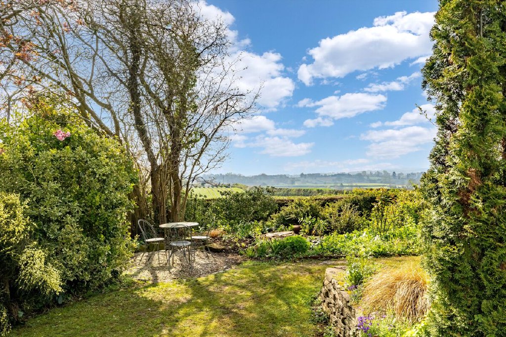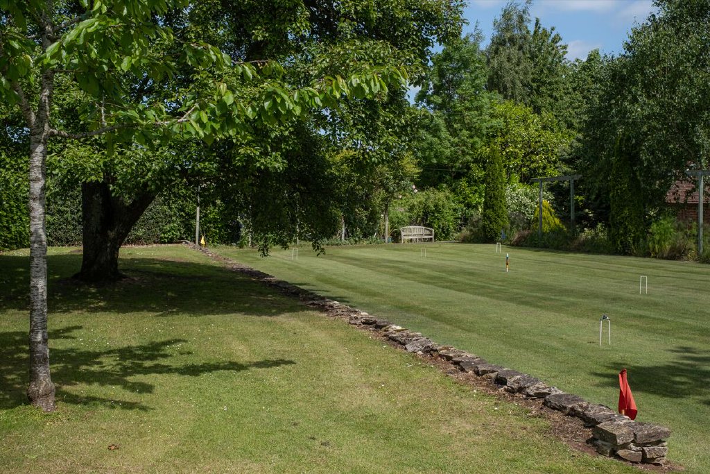 The gardens surrounding the property are mature and beautifully landscaped, with formal borders and specimen trees. There are multiple private seating and dining areas on all sides of the house, perfect for enjoying the scenic surroundings. To the west, a large croquet lawn leads to a productive kitchen garden and orchard.