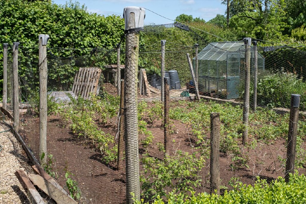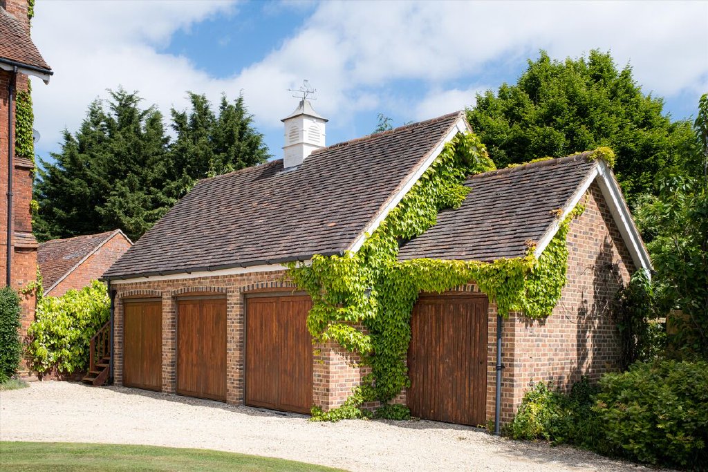 In addition to the triple garage with a store room above, the property includes several useful tool and machinery sheds, complementing the garden.