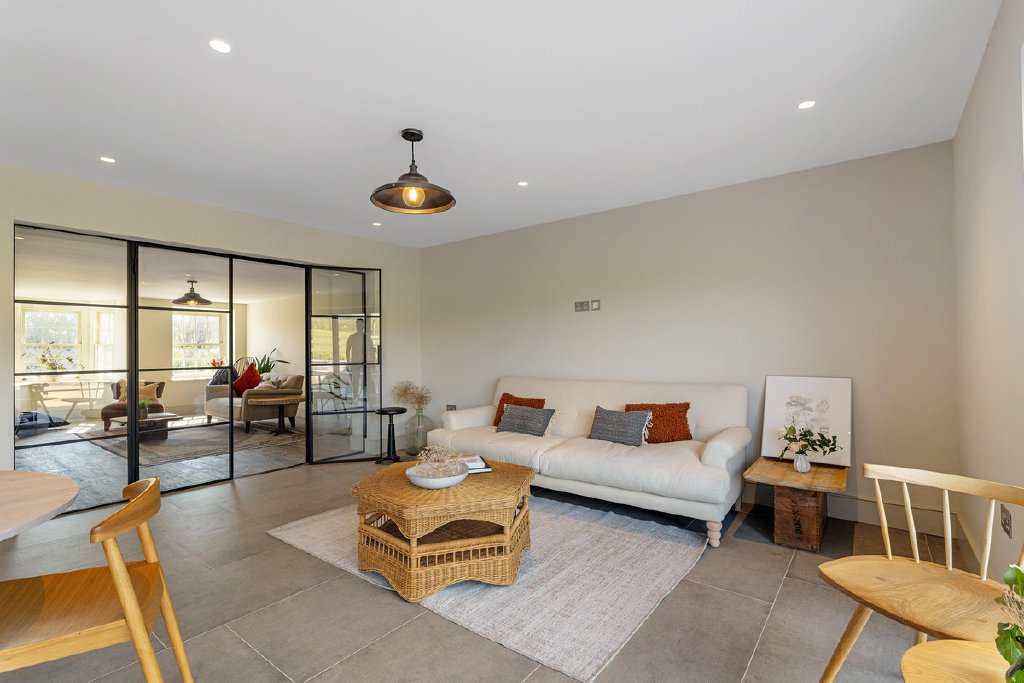 The heart of the home is a bespoke kitchen by Steven Brooker, using Masterclass cabinetry with Oak details, Quartz worktops, and a feature island with a Neff induction hob and downdraft extractor. Dual Neff ovens, a Quooker tap, and LED lighting complete the picture. This open-plan space flows into a light-filled dining and living area, where Crittall-style doors lead to a sitting room with original fireplace, a porcelain hearth, and a Contura wood-burning stove.