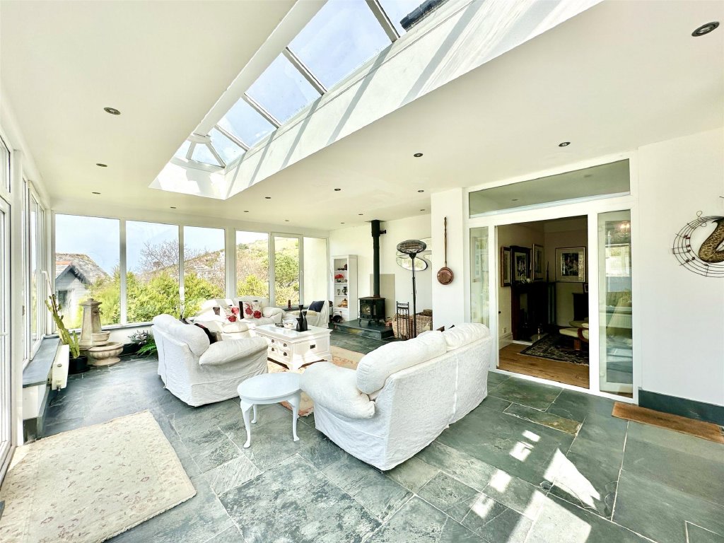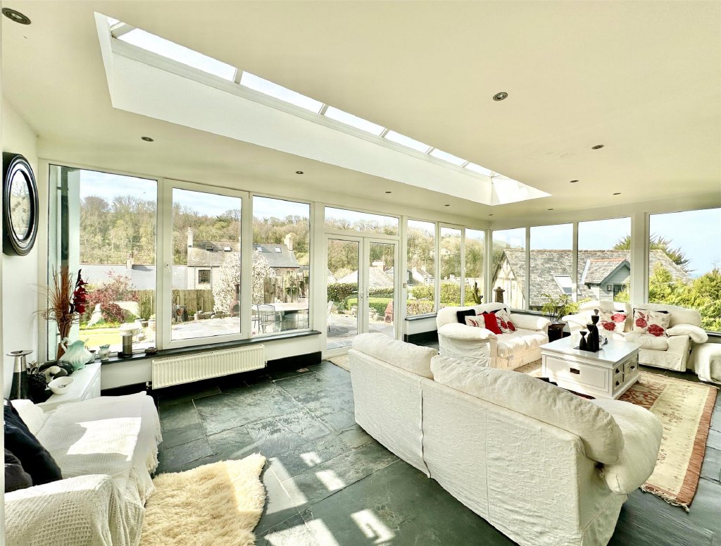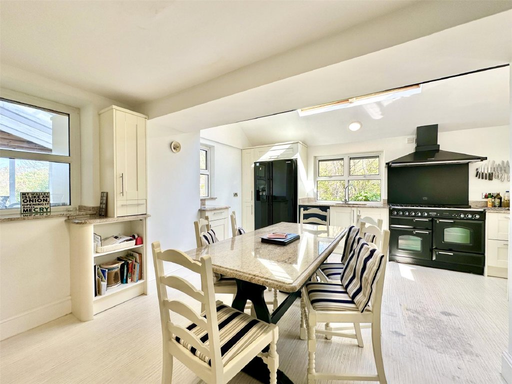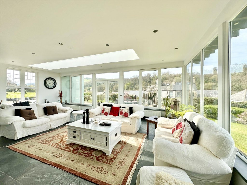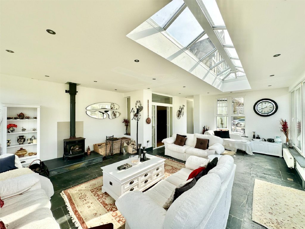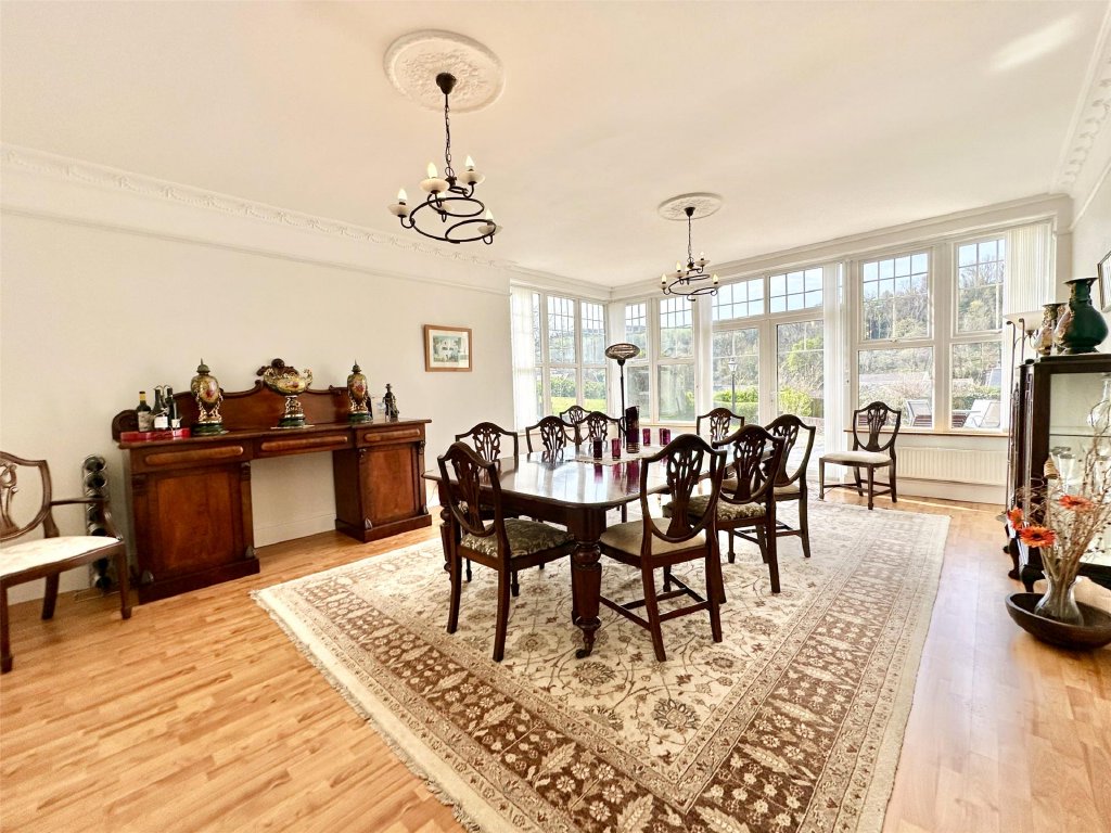 The main residence showcases a wonderful fusion of period features and modern comforts. A wealth of reception space includes the original lounge with its cosy, traditional ambience and a feature fireplace that provides a focal point to the room. The bay window at the front perfectly frames the delightful views. Across the hallway is a separate snug, ideal for quiet relaxation. The snug has glazed double doors that open into the spectacular 26ft x 19ft conservatory/sun lounge—flooded with natural light and perfectly positioned to make the most of the glorious views. A large roof lantern crowns the room, adding to the atmosphere of openness. For those cooler autumnal and winter days, a wood burner set on a slate hearth provides comforting warmth making this stunning room perfect for year-round living. Glazed double doors allow a seamless connection with an expansive front sun terrace blending indoor and outdoor living effortlessly. Complementing this is the impressive 21ft x 15ft dining room extension, a gloriously bright and generous space that lends itself beautifully to entertaining, family gatherings and dinner parties. Again, there is direct access onto the front sun terrace, enabling diners to flow naturally from inside to out as they continue their enjoyment.
